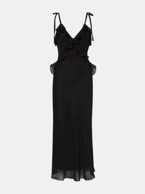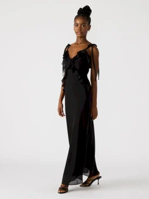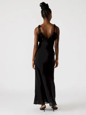 Be the center of attention in the stunning ADALINA dress. This dress features a v-neckline and ruffle detail that will make you stand out on any occasion. With its sleeveless design, this maxi dress is the perfect addition to your wardrobe.