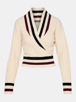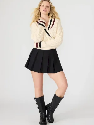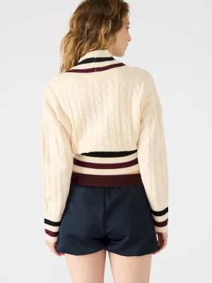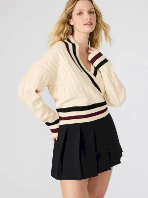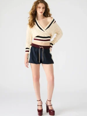 Accented with varsity-inspired striping, ADDISON is a versatile pullover sweater with a faux wrap that you can wear on or off the shoulders.