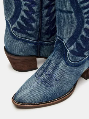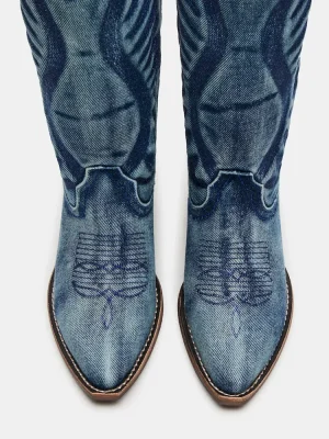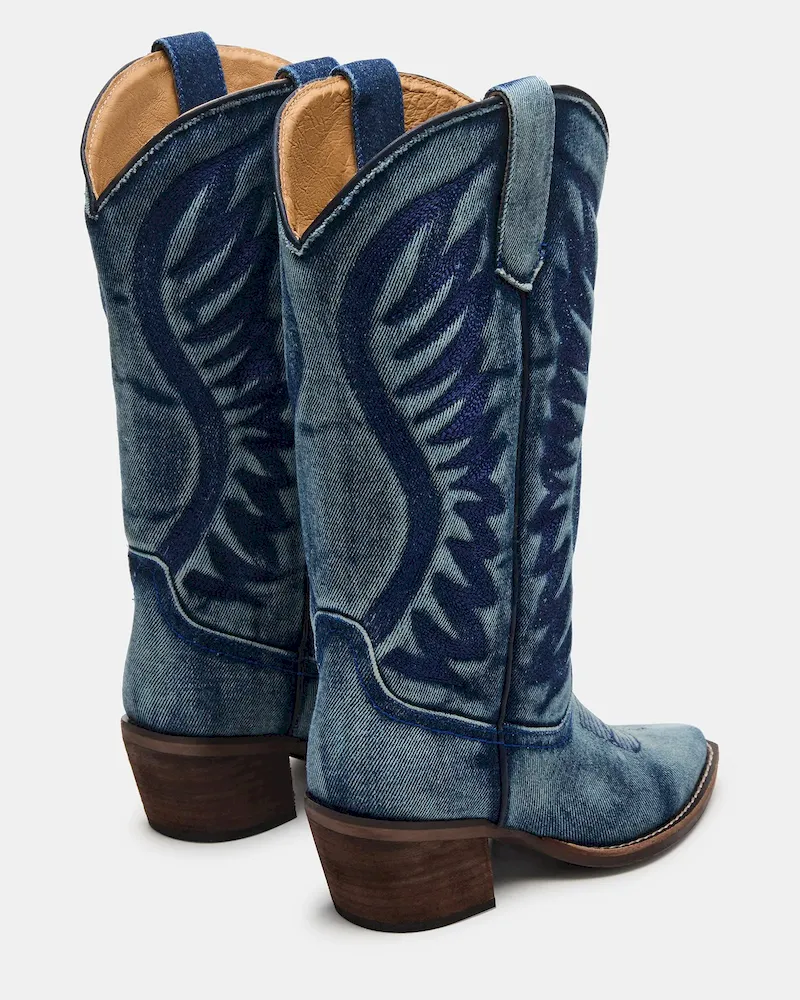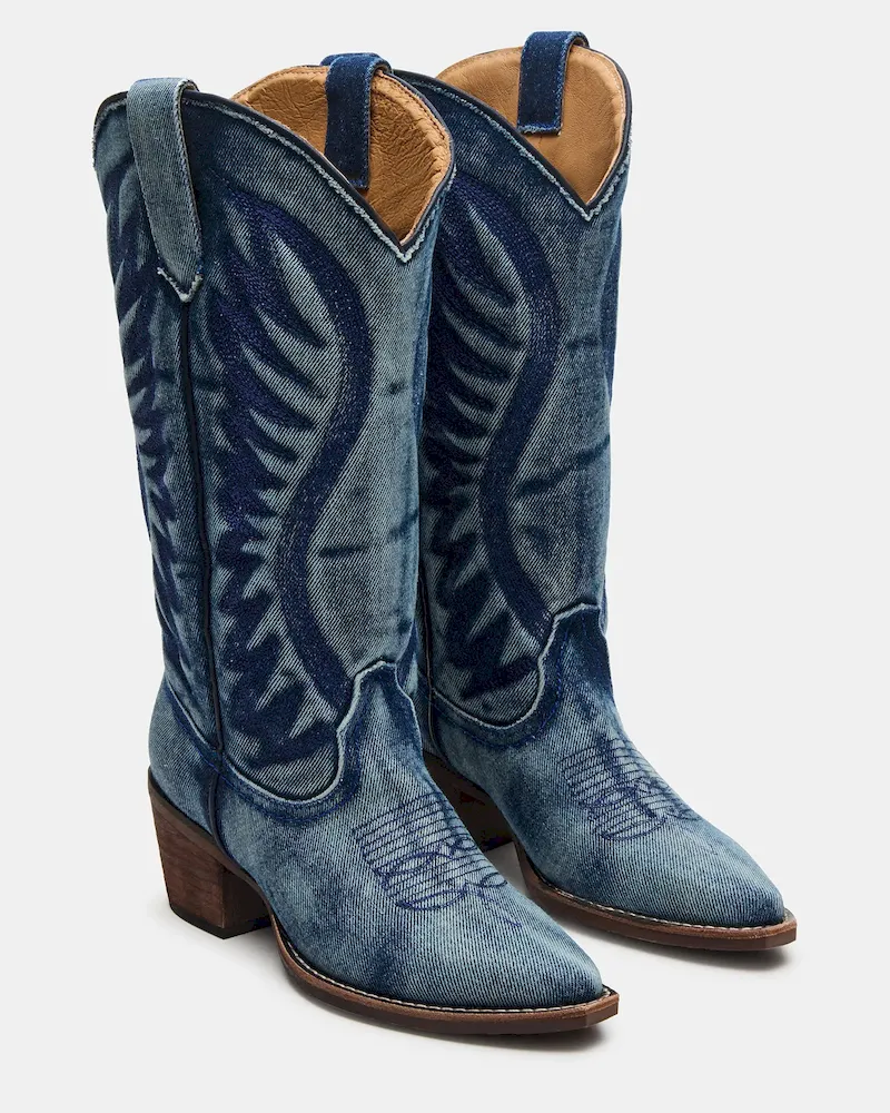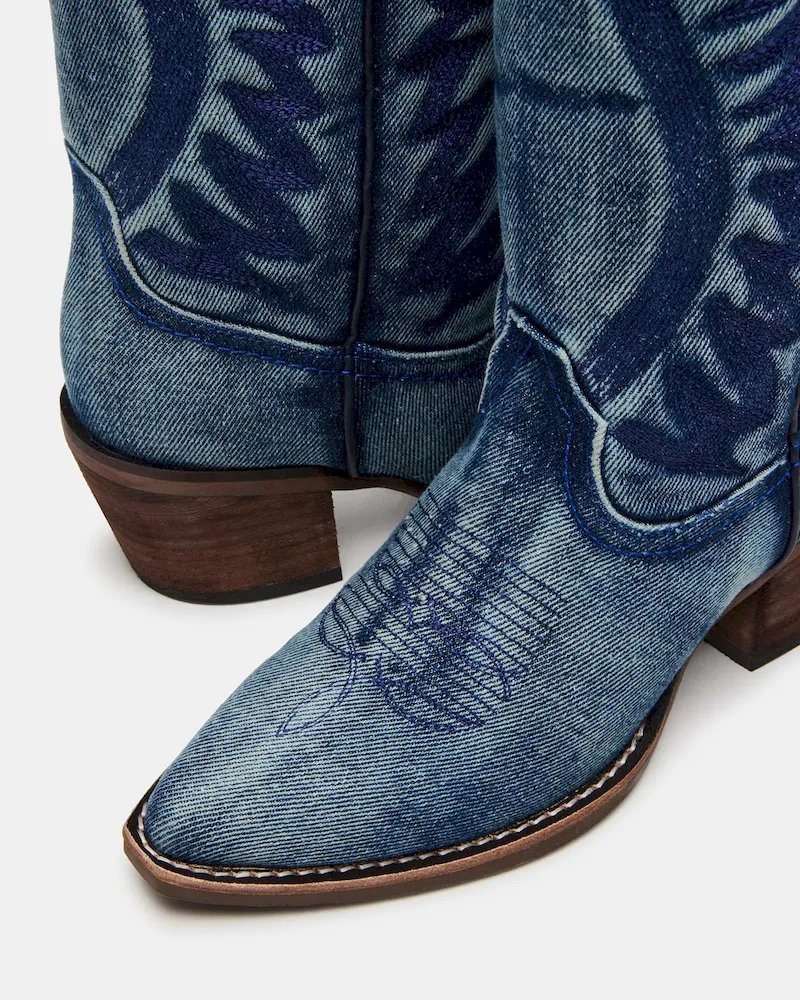 Expertly crafted, these ALBANY DENIM FABRIC WIDE CALF boots boast a pointed-toe design and traditional Western style. Made from quality materials, these boots are both stylish and durable. Perfect for any occasion, these boots will elevate any outfit.