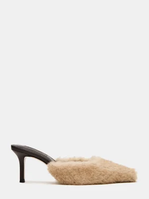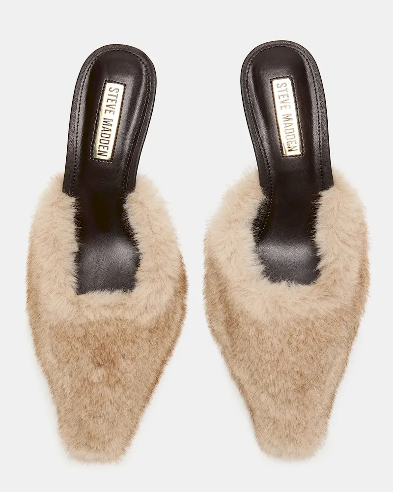Elevate your footwear collection with the ALEXI FAUX FUR TAN, a sophisticated pointed-toe mule heel. Crafted with premium detailing, this versatile silhouette combines contemporary style with walkable comfort.