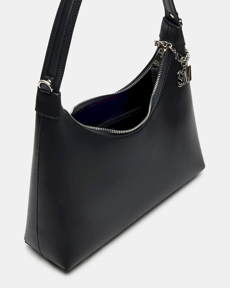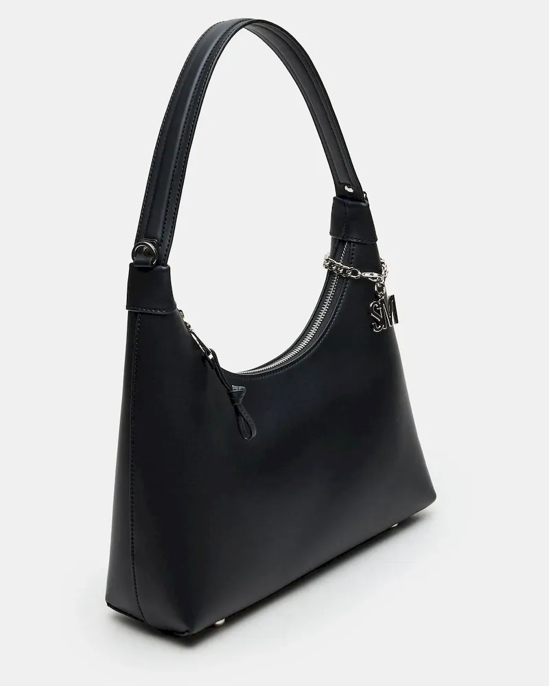 The AMARI BAG BLACK offers a sleek top-zipper design for secure and easy access. It includes an attachable logo chain charm that adds a refined detail, enhancing its sophisticated style. Inside, a pouch is conveniently placed on the back wall for organized storage of essentials. This shoulder bag blends practical features with elevated design, making it a versatile choice for everyday use.