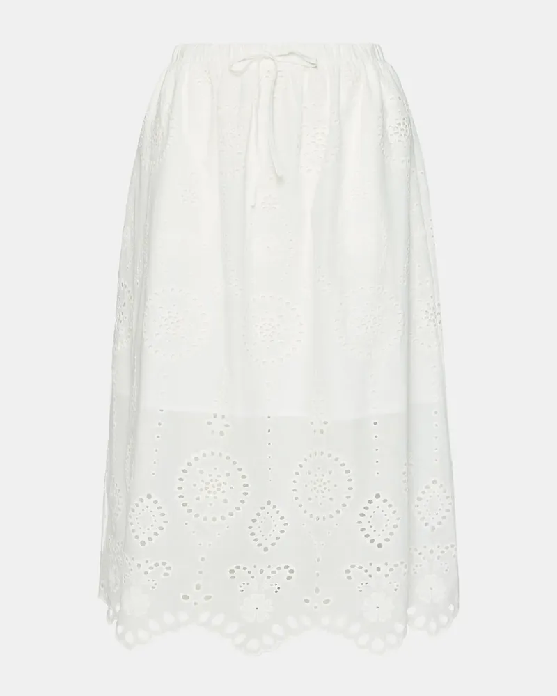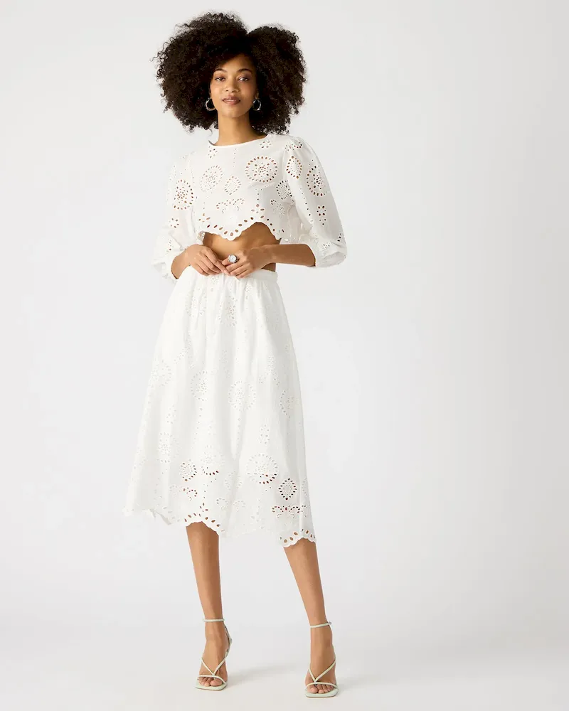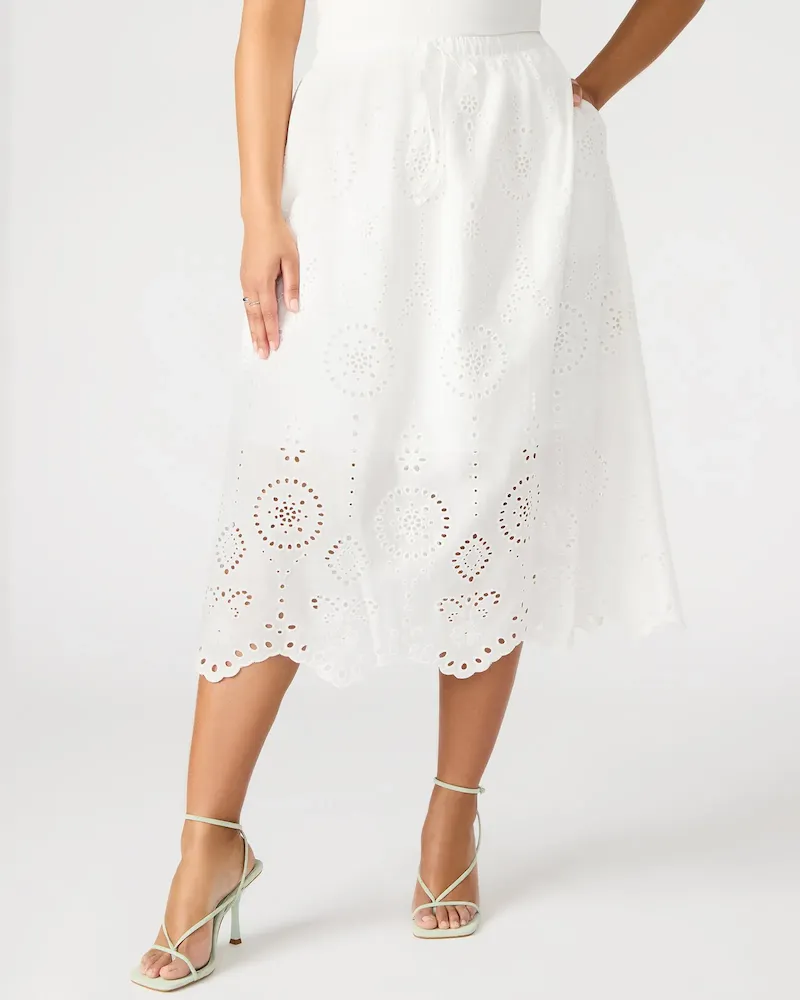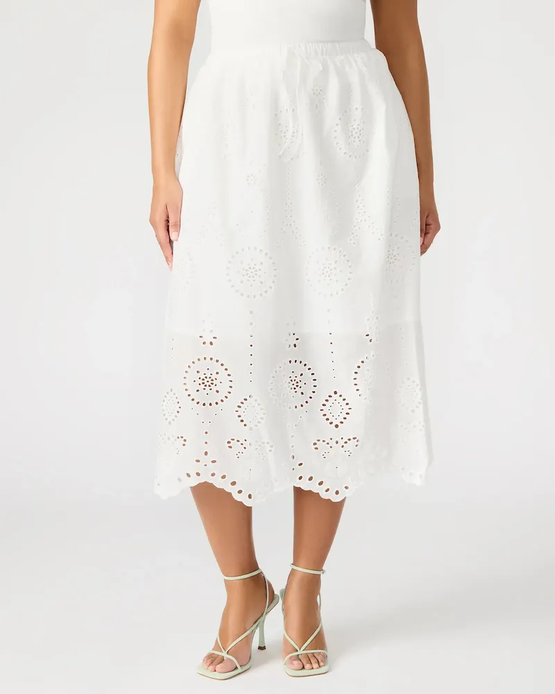 This ANAISA skirt is perfect for any occasion. Its flowy midi length flatters your silhouette, while the eyelet detailing adds a touch of elegance. The matching set option allows for effortless styling. Elevate your look with this flowy and versatile skirt.