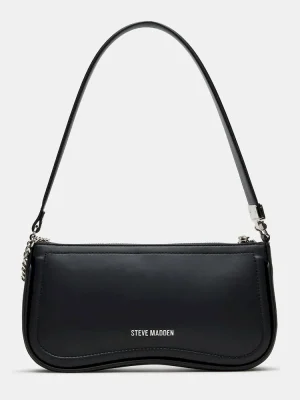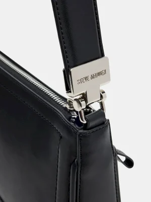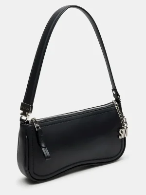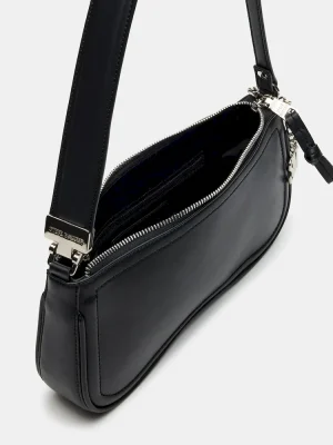 The ANGEL BAG BLACK features a sculpted top-zipper design for secure and stylish access. Inside, an interior pouch on the back wall provides organized storage for essentials. A distinctive logo chain bag charm adds a refined, expert touch that complements the sleek silhouette, making this shoulder bag both functional and sophisticated for everyday wear.
