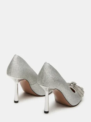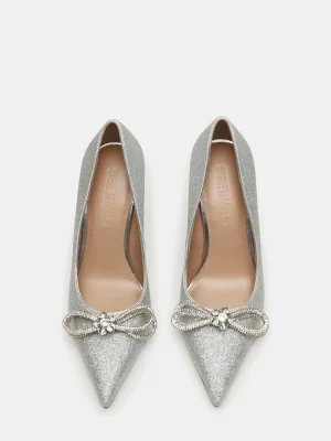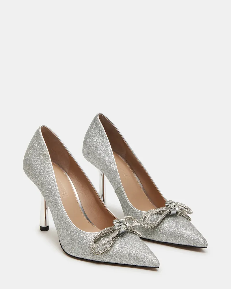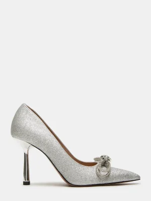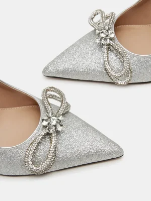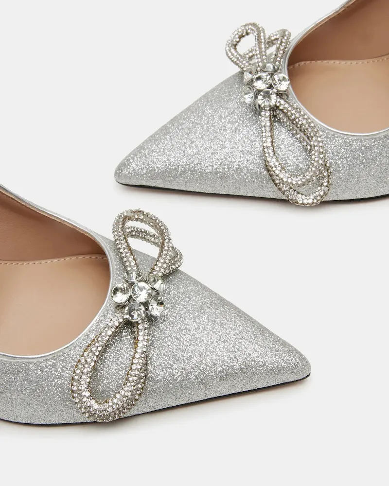 The ANTOINETTE is a pointed toe pump heel featuring a stunning rhinestone bow detail and a delicate glitter design. Combining elegance and sophistication, these heels add a touch of glamour to any outfit. The pointed toe design provides a flattering and chic look, while the glitter adds a unique and feminine touch. With the added sparkle of the rhinestone bow, these heels are perfect for any special occasion.