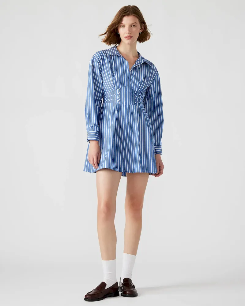 The ARIA dress is a must-have for your wardrobe. The menswear-inspired design features a corset waist and back waist smocking for a flattering fit-and-flare silhouette. Made from soft cotton poplin, this mini dress will be your go-to for any occasion.
