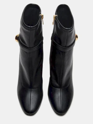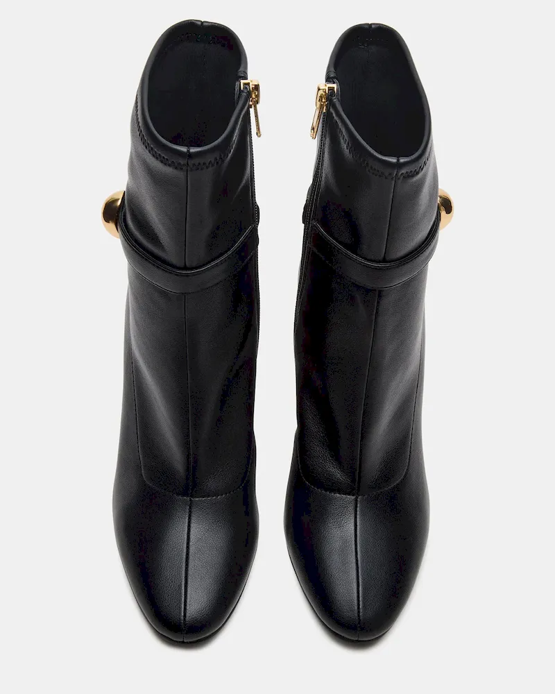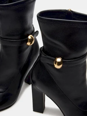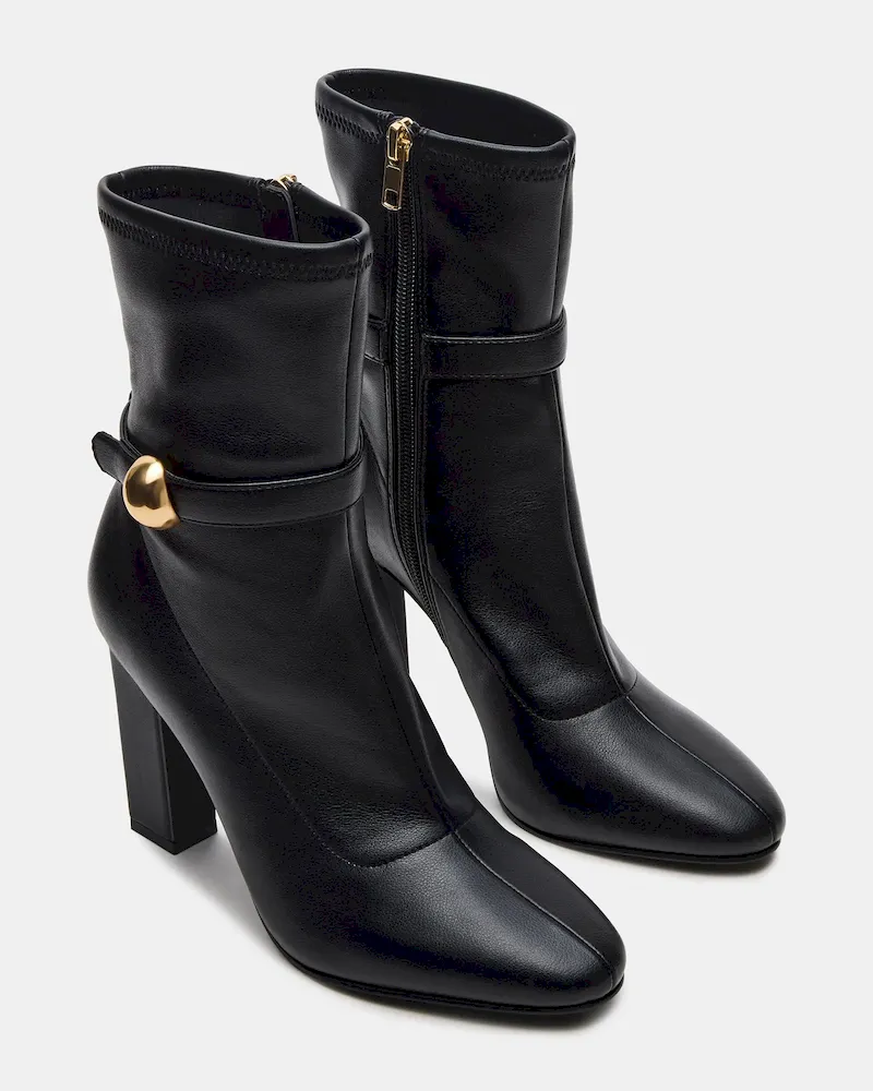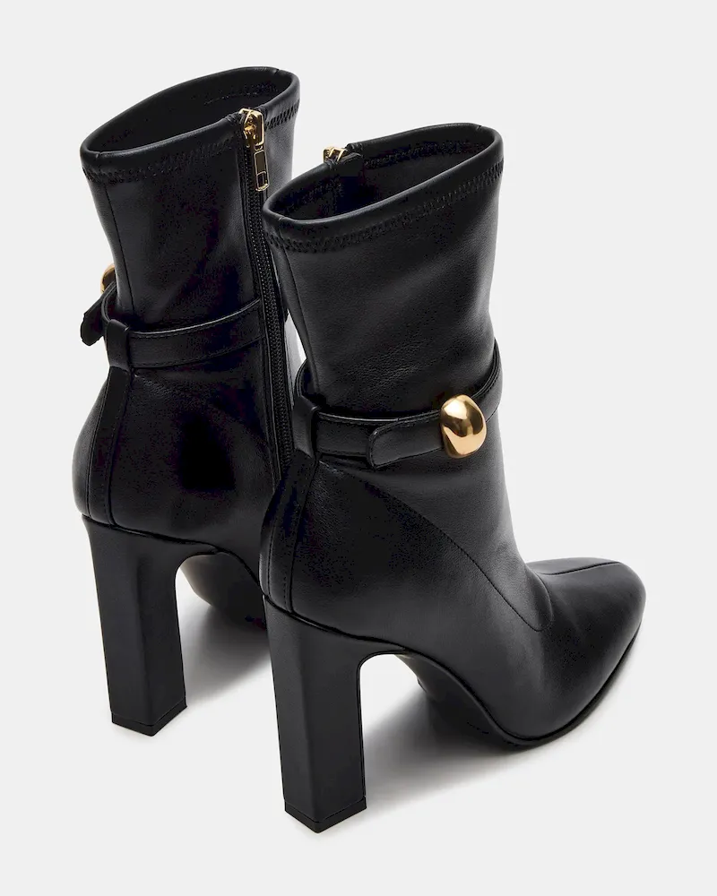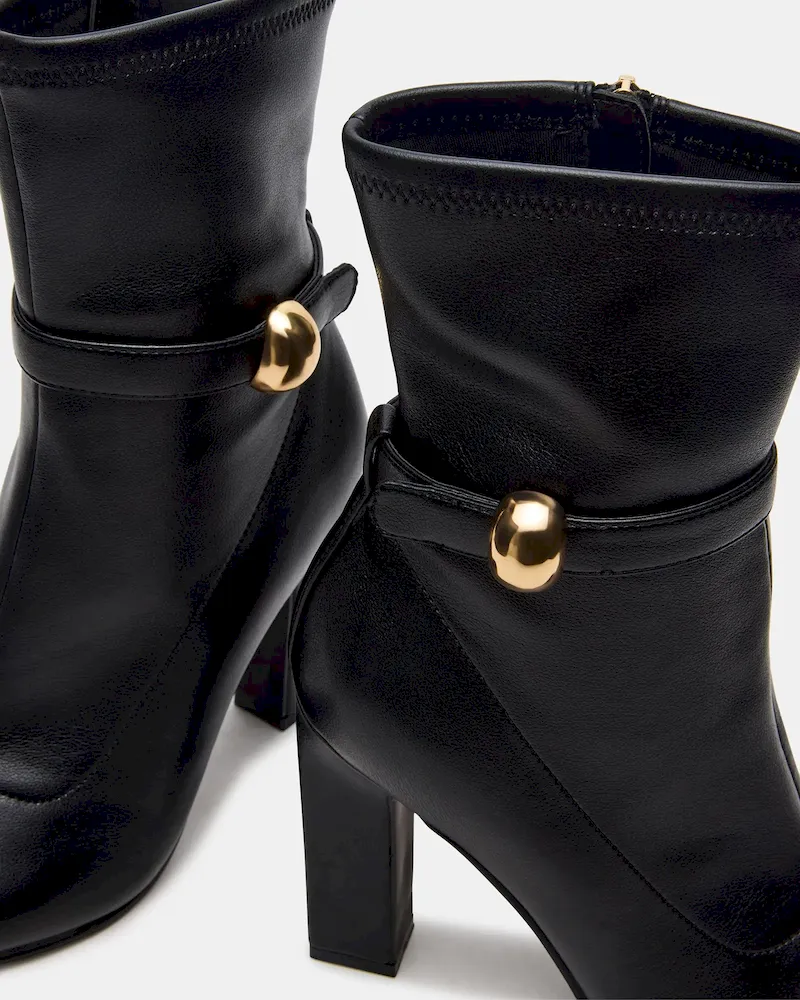 Elevate your style with the AROMA BELT BLACK heeled bootie, featuring a sturdy block heel for all-day comfort and stability. The sleek black design is enhanced by subtle gold detailing, adding a refined touch of luxury. Perfect for both professional and casual settings, this bootie combines modern elegance with practical wearability.