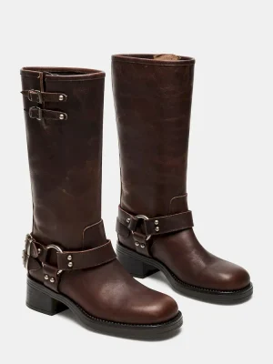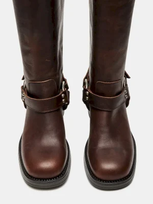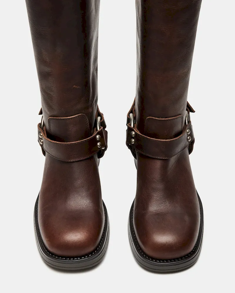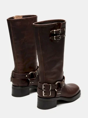 The ASTOR square toe boot features a slouchy mid-calf silhouette reinforced with strap accents and substantial buckle hardware. A wide sole with a block heel provides a solid foundation for this engineer-inspired design.
