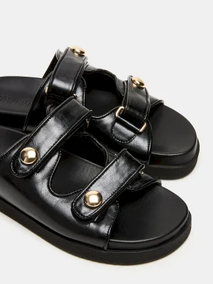 The ATHENS BLACK LEATHER sandal features a cushioned footbed designed for all-day comfort paired with a modern flatform sole that provides subtle height without compromising stability. Crafted in sleek materials, this slide offers a versatile look that seamlessly transitions from casual outings to elevated summer styles. Its minimalist design emphasizes both function and contemporary appeal, making it a refined choice for those seeking effortless sophistication in their footwear.