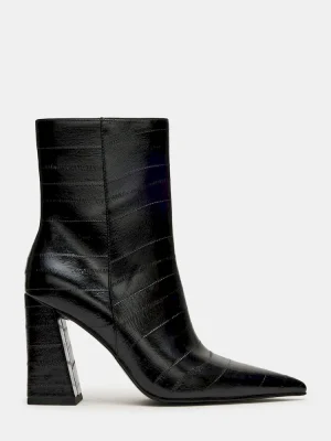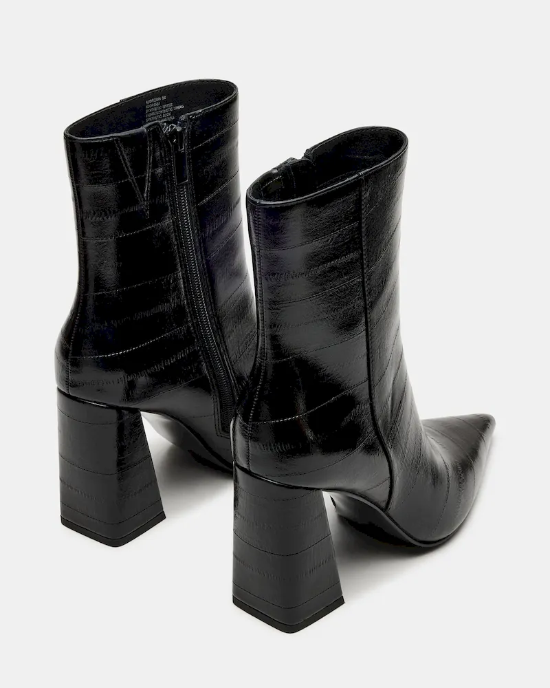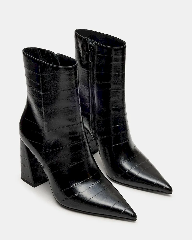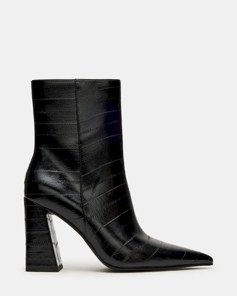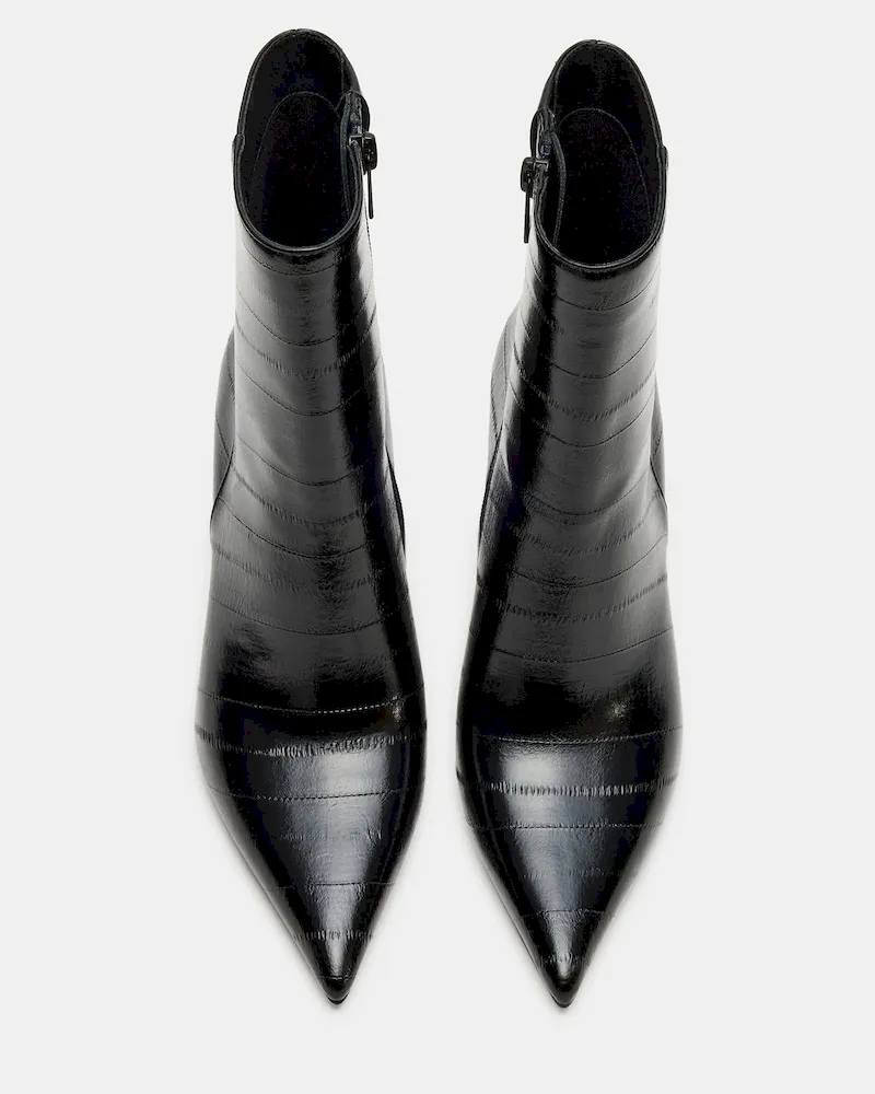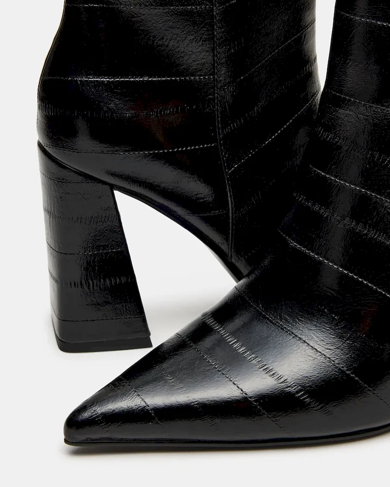 Step into sophistication with the AUDREANA BLACK EEL ankle bootie. Featuring a sturdy block heel for all-day comfort and a pointed toe for a sleek silhouette. This versatile bootie combines contemporary design with practical wearability, making it an essential addition to your footwear collection.