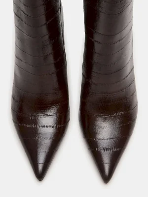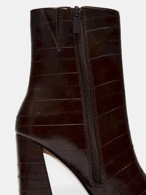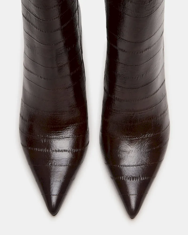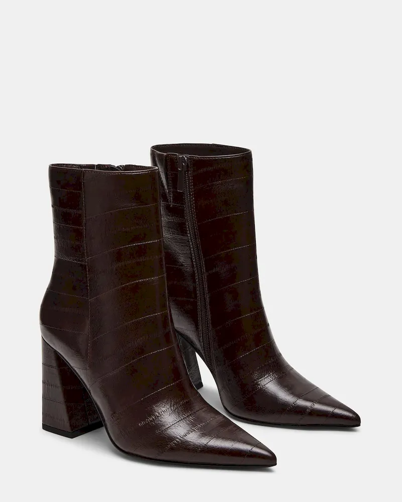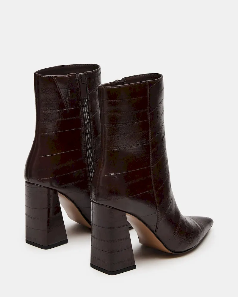 Step into sophistication with the AUDREANA BROWN EEL ankle bootie. Featuring a sturdy block heel for all-day comfort and a pointed toe for a sleek silhouette. This versatile bootie combines contemporary design with practical wearability, making it an essential addition to your footwear collection.