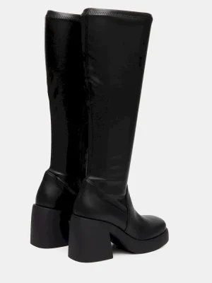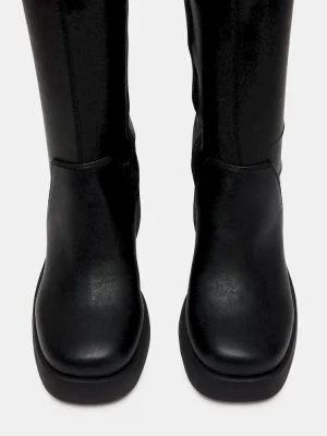 The BERKLEIGH BLACK WIDE CALF square toe knee boot gives you a sleek and defined silhouette with a stretch fabric construction and platform sole with a block heel.