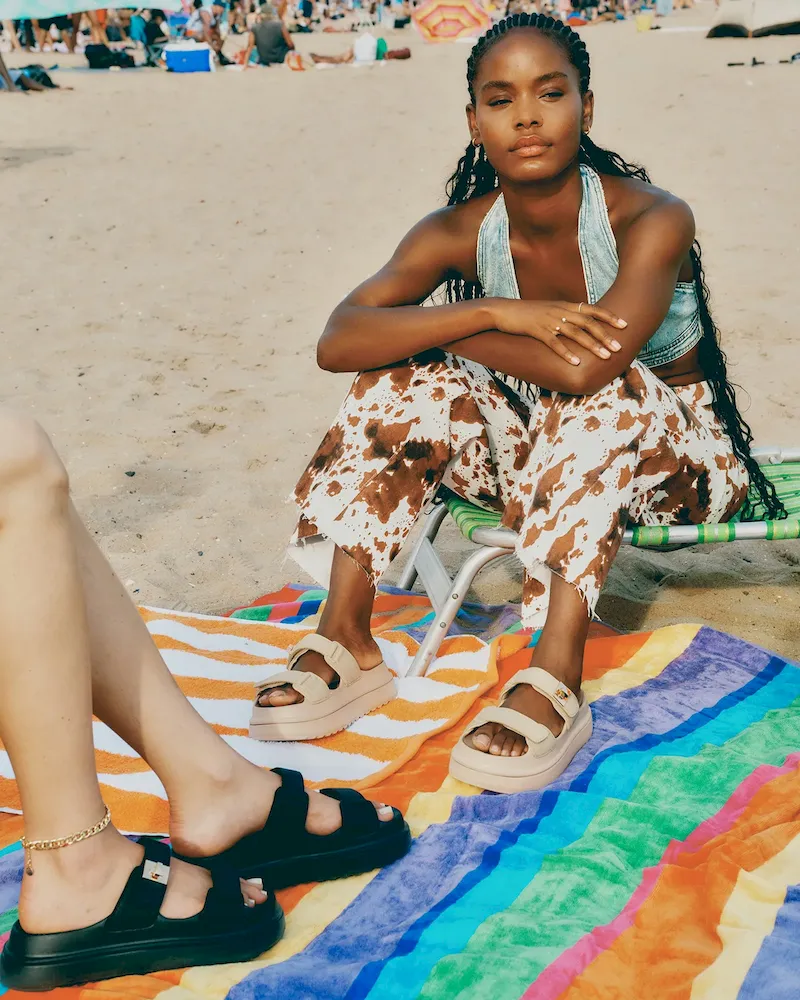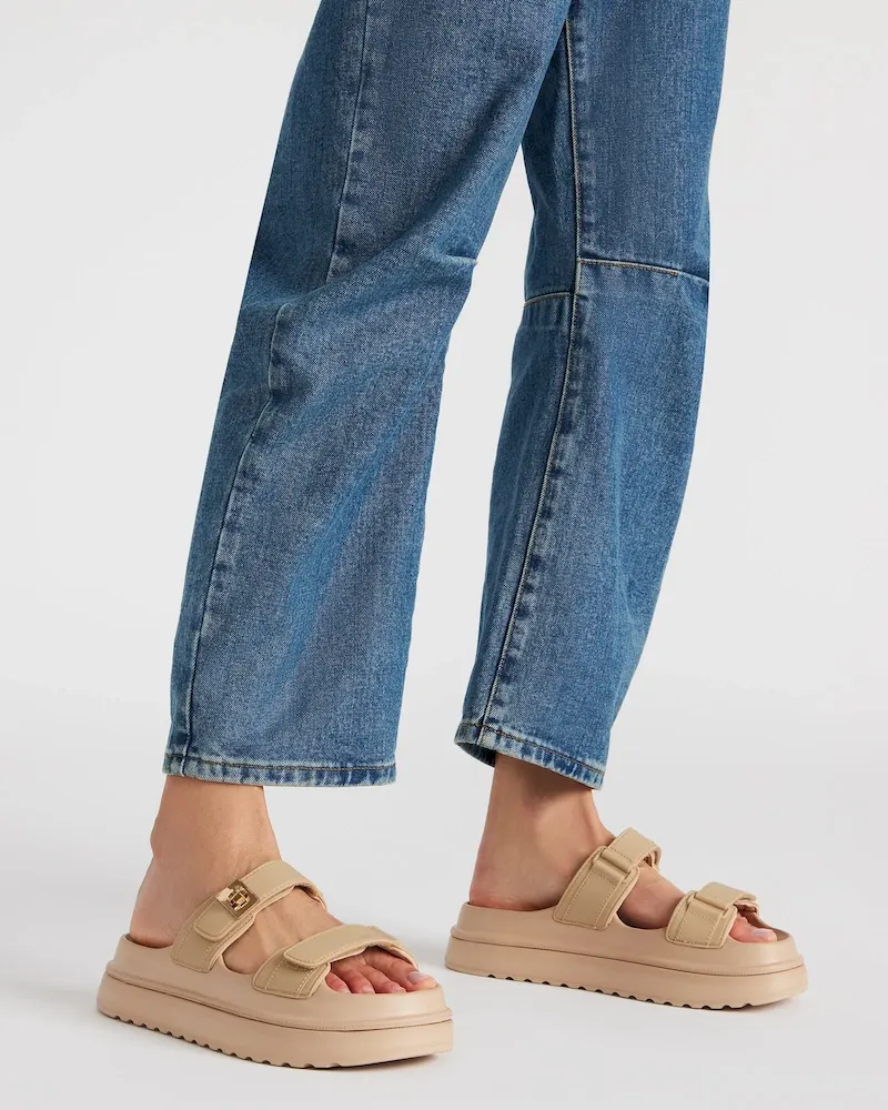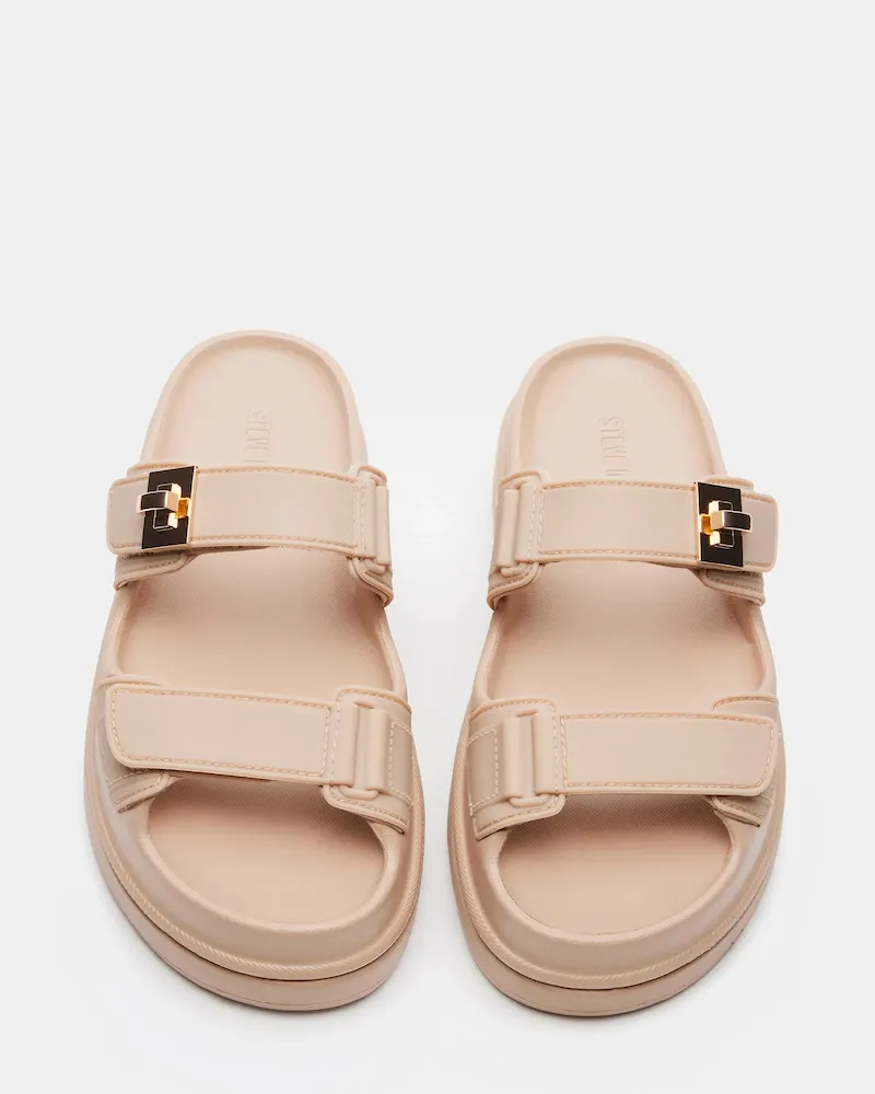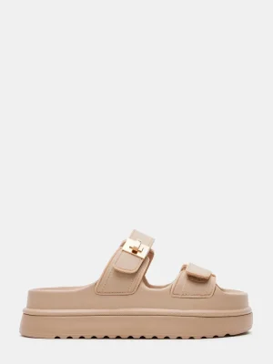 Elevate your style with the BIGSCHMONA JELLY platform slide sandal. The flatform design provides a modern twist while the turn-lock hardware accent adds a touch of sophistication. Step up your fashion game while enjoying the comfort and stability of this versatile shoe.