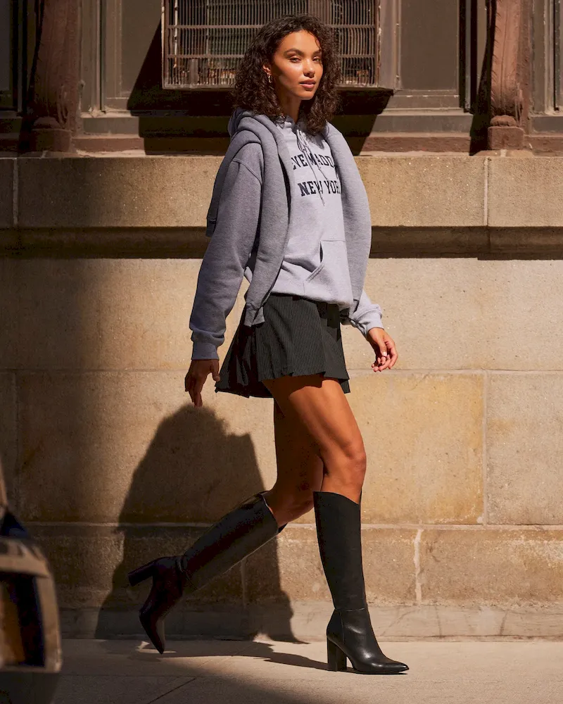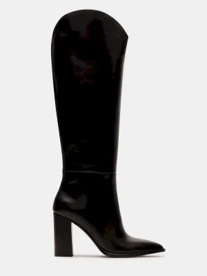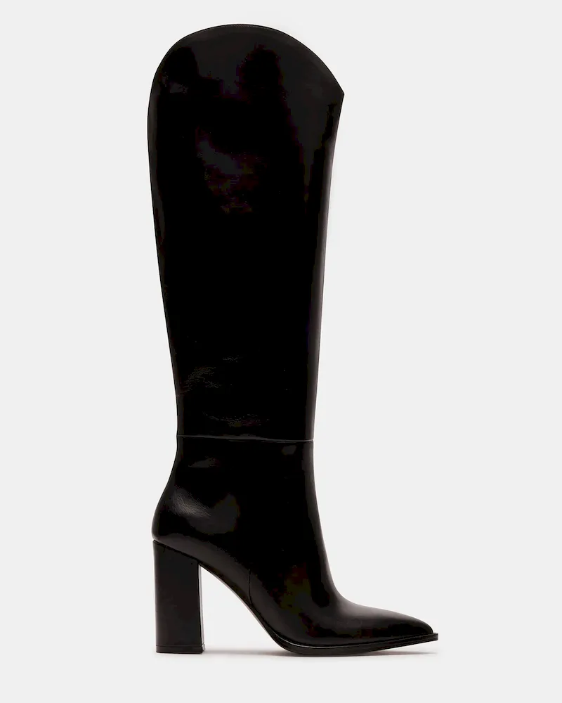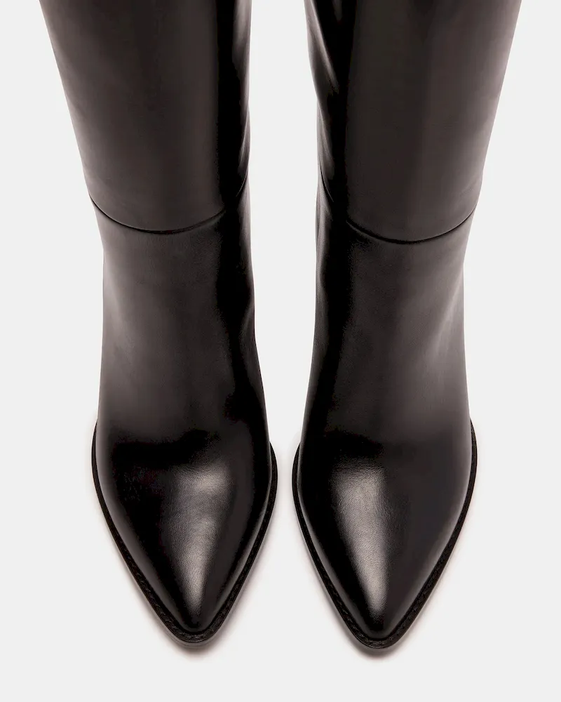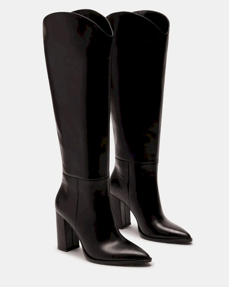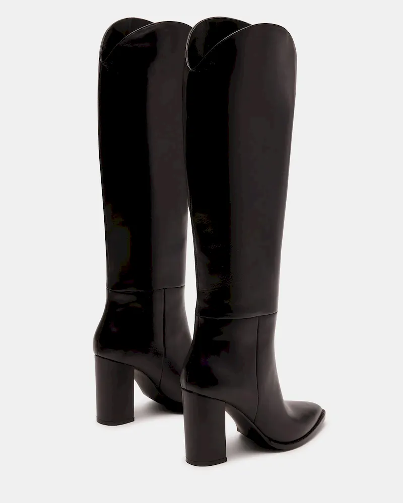 A pointed toe and curved topline give the BIXBY block heel knee boot a Western edge while the sleek upper highlights the clean monochrome look