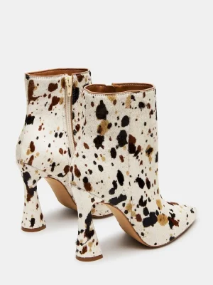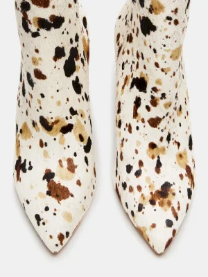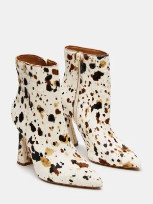 Expertly crafted and designed, the BOLERO TAN COW PRINT pointed-toe ankle boot offers both style and convenience with its inside zip feature. A versatile choice for any fashionista, this heeled bootie adds a touch of sophistication to any outfit. Perfect for transitioning from day to night.