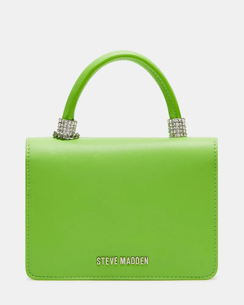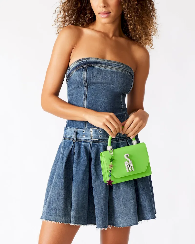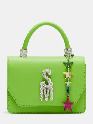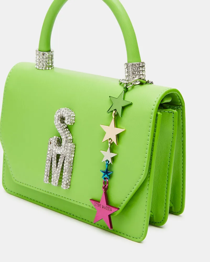 The BRAT mini bag features a top handle and a multi-colored star charm with bubble letter logo letters for a trendy look. With a crossbody strap and interior back wall, it offers convenience and organization while making a stylish statement.