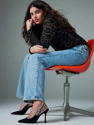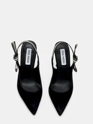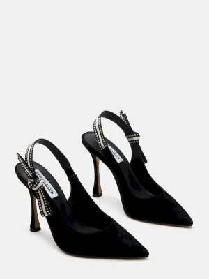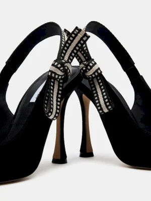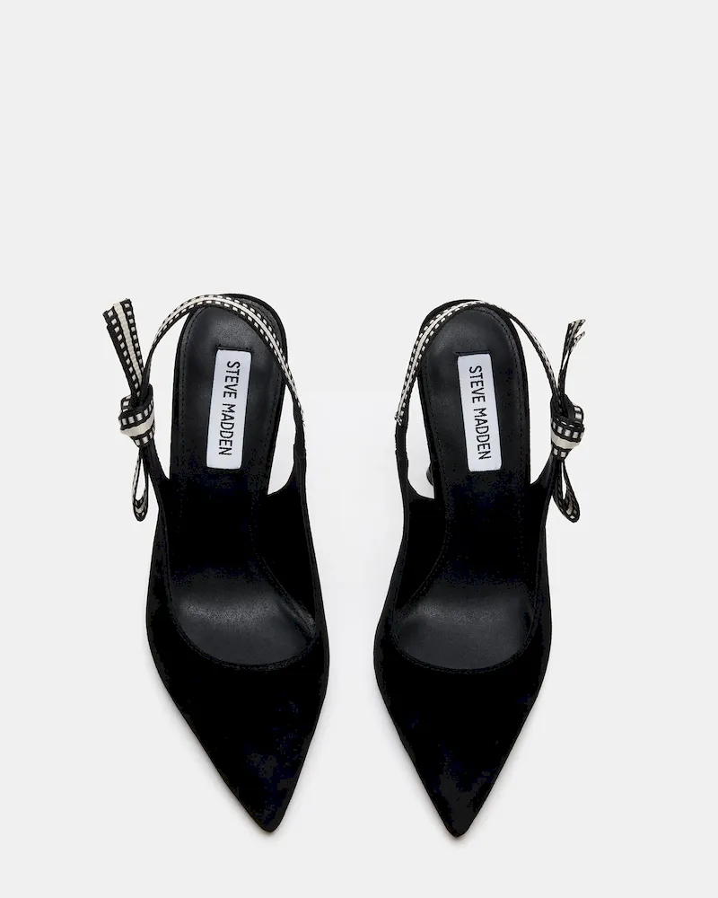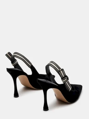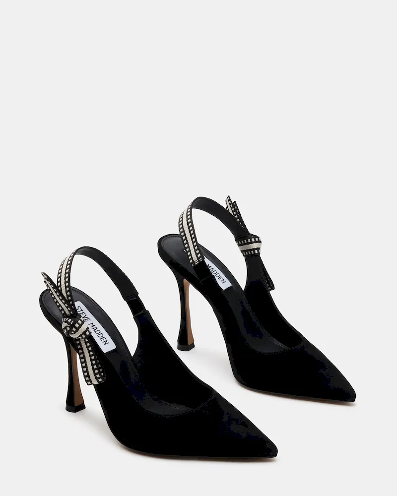 A grosgrain ribbon wraps around the slingback strap of the BRI point toe stiletto pump and finishes with a bow accenting the side of the shoe.