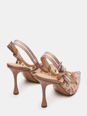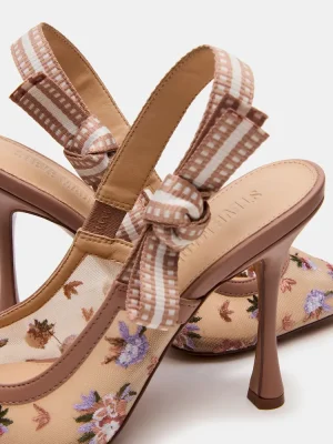 A grosgrain ribbon wraps around the slingback strap of the BRI point toe stiletto pump and finishes with a bow accenting the side of the shoe.