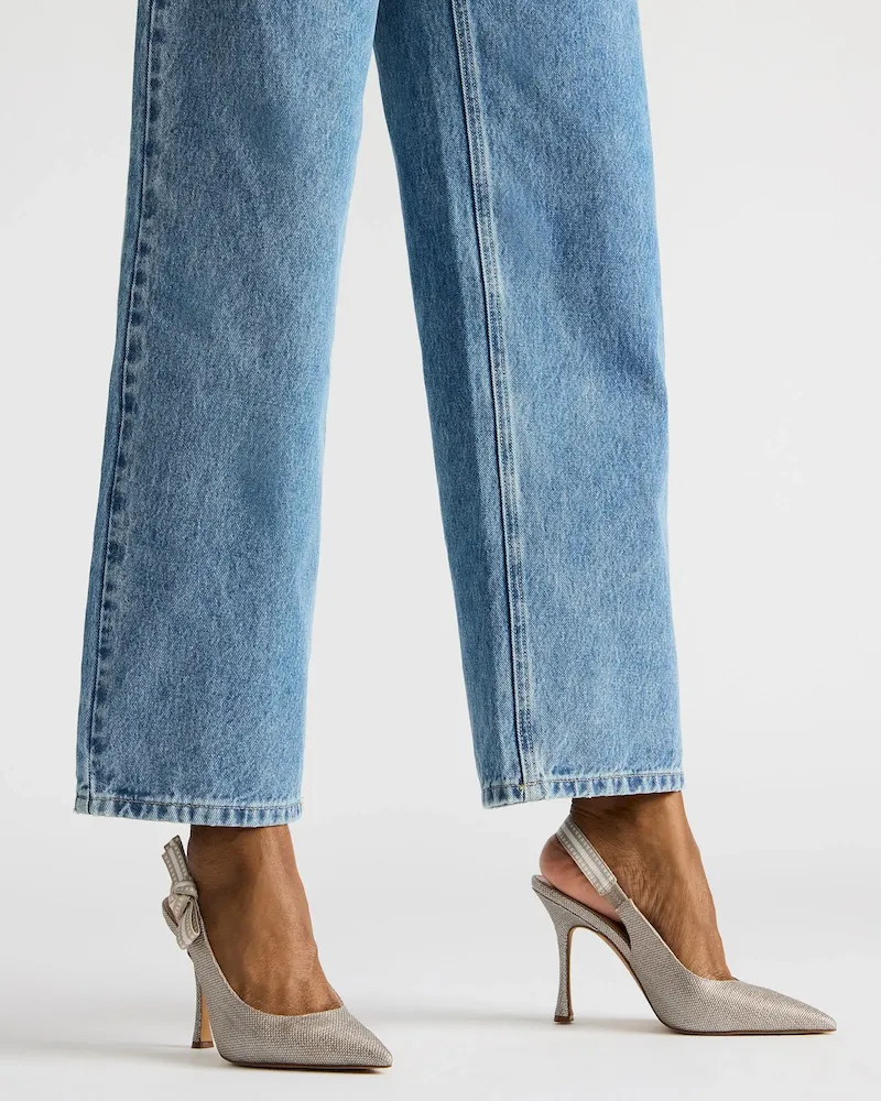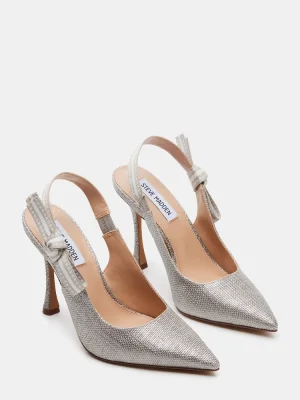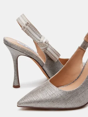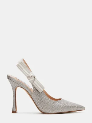 A grosgrain ribbon wraps around the slingback strap of the BRI point toe stiletto pump and finishes with a bow accenting the side of the shoe.