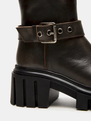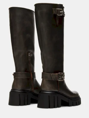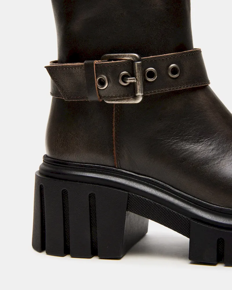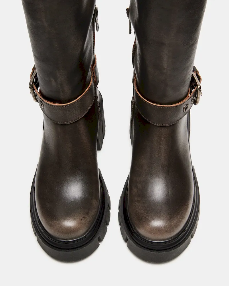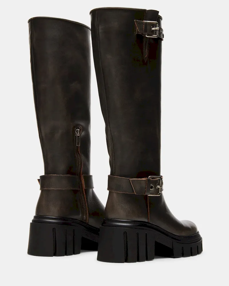 These BRIGADE boots feature a unique moto design and buckle details, making them a stylish choice for any outfit. With a lug knee-high fit, these boots provide both fashion and function. The perfect addition to any wardrobe for a trendy, edgy look.