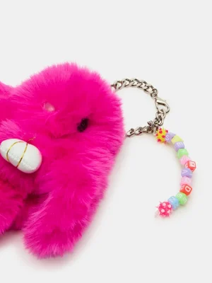 This BUNNY BAG CHARM features bright multi-colored alphabet beads and rubber spike beads, making it a perfect and unique accessory. The small lobster clip and curb chain make it easy to attach to any bag, while adding a fun and playful touch. A must-have for any bag charm lover!
