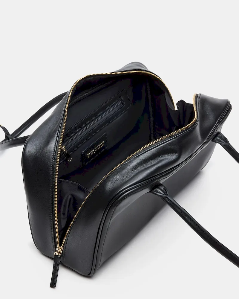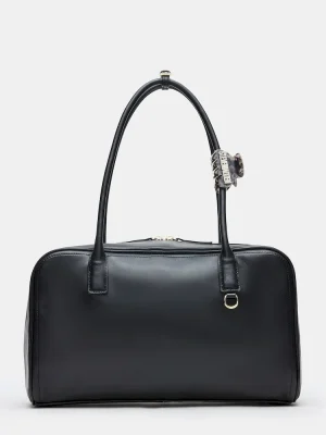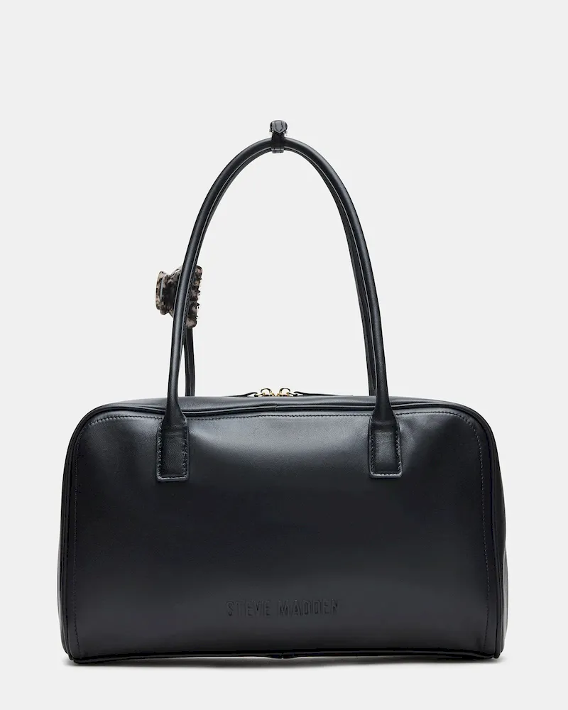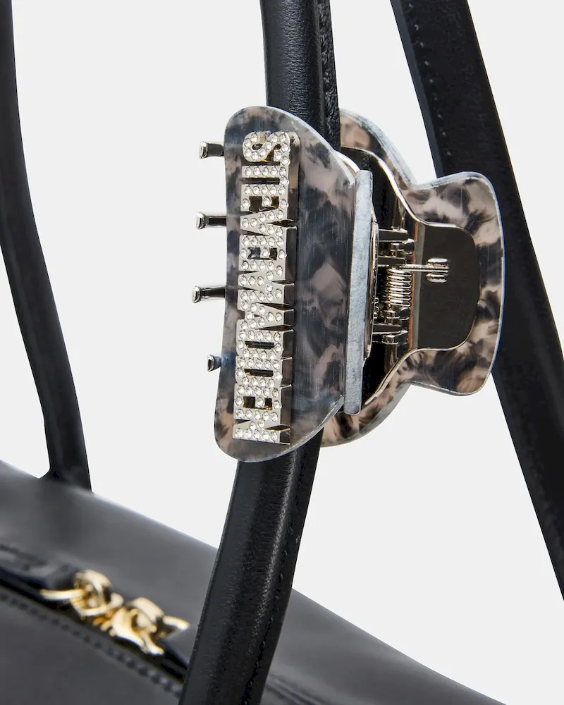 The CANDICE BAG BLACK is a sophisticated box satchel designed for versatile wear with its tubular shoulder straps and an attachable rhinestone embellished hair clip for added elegance. Featuring a secure zipper closure, it offers organized storage with an interior pouch on the back wall and gussets that expand for extra capacity, making it both stylish and practical for everyday use.