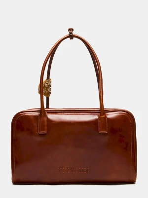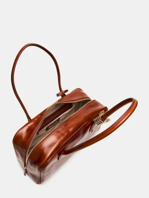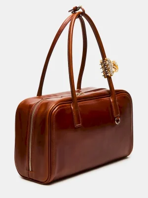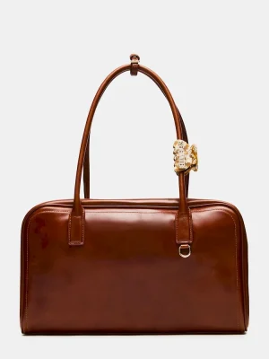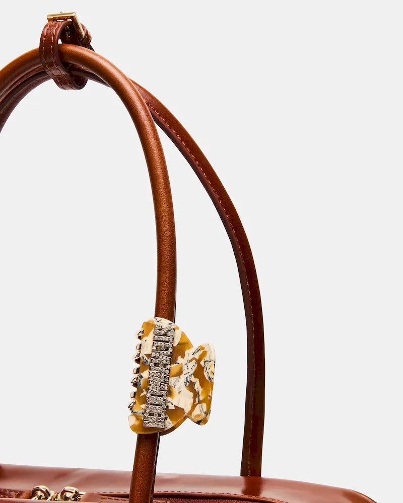The CANDICE BAG RUST is a sophisticated box satchel designed for versatile wear with its tubular shoulder straps and an attachable rhinestone embellished hair clip for added elegance. Featuring a secure zipper closure, it offers organized storage with an interior pouch on the back wall and gussets that expand for extra capacity, making it both stylish and practical for everyday use.