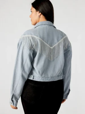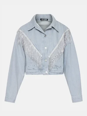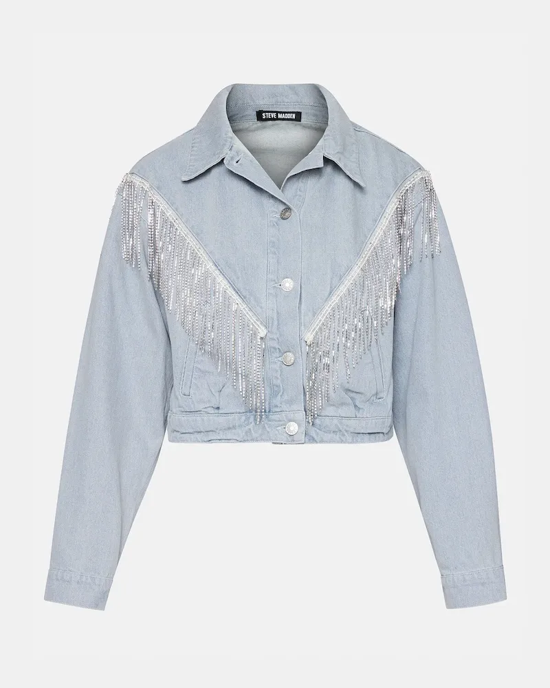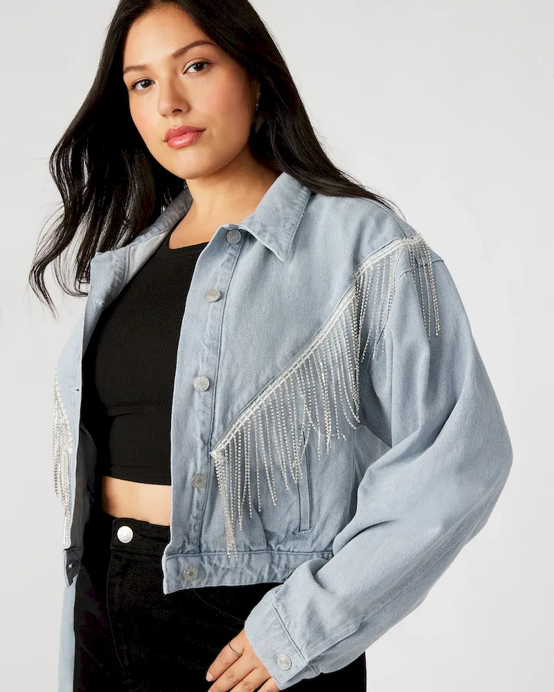 Expertly crafted, the CANYON denim jacket is a must-have addition to any wardrobe. This cropped denim jacket features exquisite rhinestone fringes for a touch of Western glamour, while the button-up closure ensures a perfect fit.