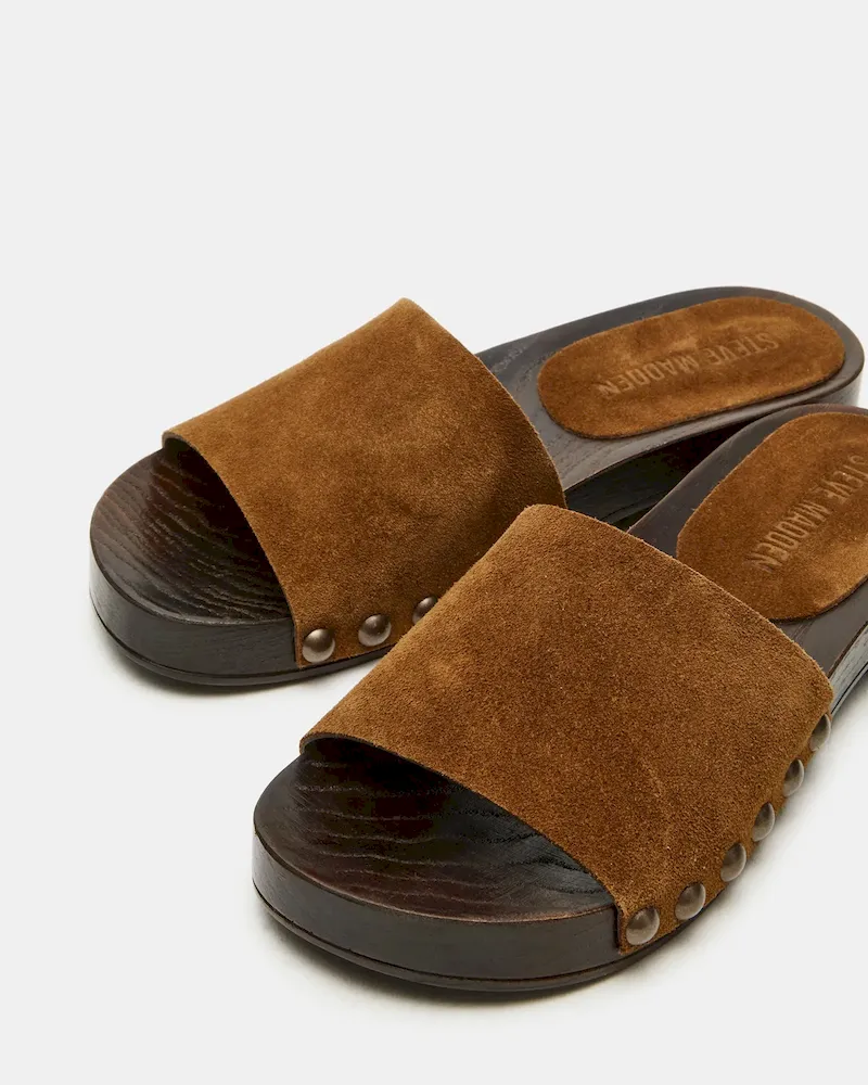 Elevate your style with the CENTO studded slide sandal. Crafted with genuine suede and chic studs, this sandal offers comfort and sophistication. Perfect for any occasion, these slides are a statement piece to add to your wardrobe.