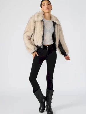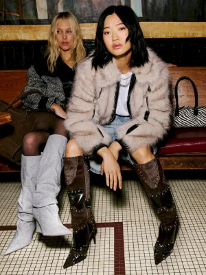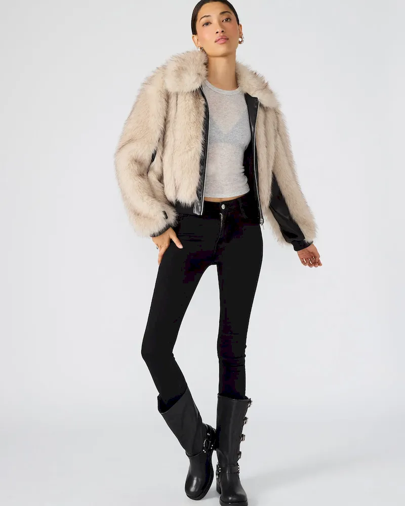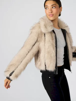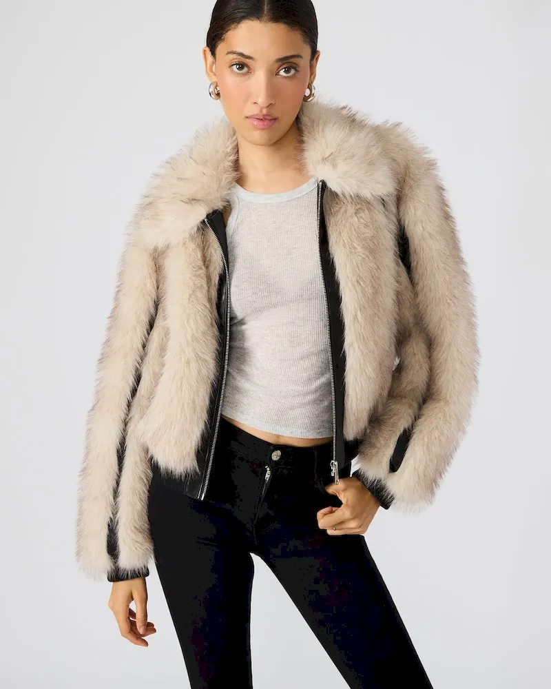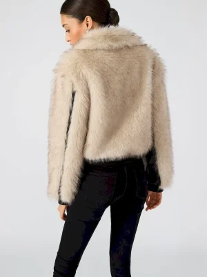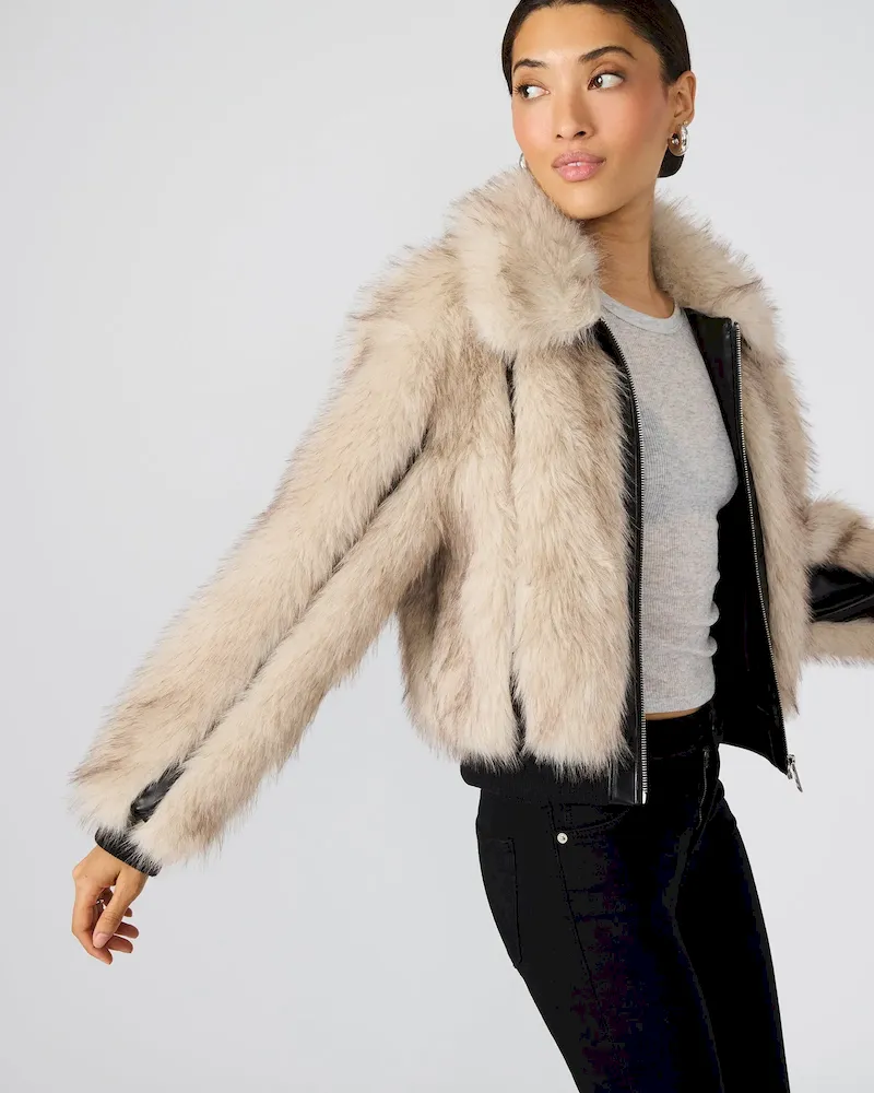 Elevate your outerwear collection with the CHARMAINE jacket featuring a luxurious faux fur construction for warmth and style. This long-sleeved jacket is designed with a classic collared neckline and detailed with sophisticated faux leather trim accents, adding a refined edge to its plush texture. Perfect for cooler days, it combines comfort and elegance seamlessly, making it a versatile choice for both casual and dressier occasions.