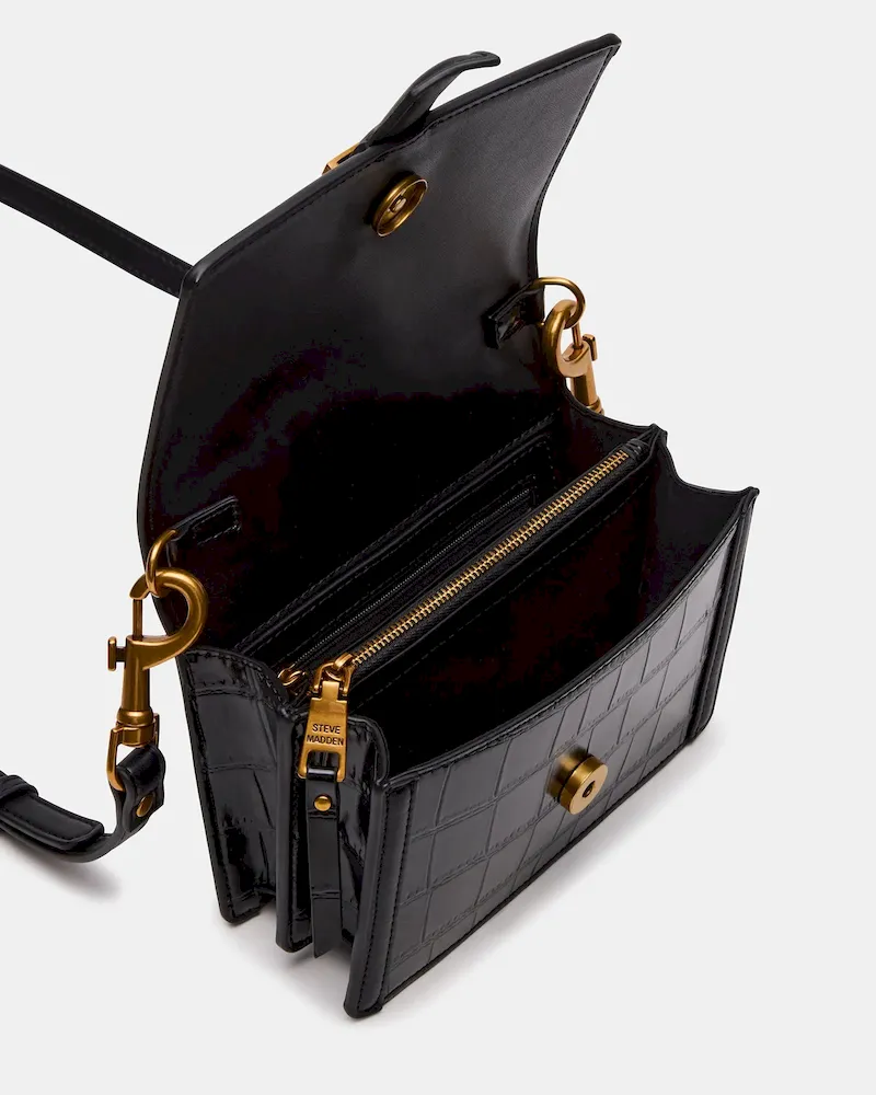 The CLARK BAG BLACK offers a sleek, structured design with a convenient mini top-handle for versatile carrying. It includes an attachable crossbody strap, allowing hands-free wear. A magnetic snap closure secures your essentials, while the interior zipper compartment provides organized storage for smaller items. This bag combines functionality with refined style, perfect for those seeking a polished accessory with practical features.