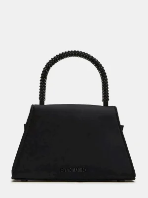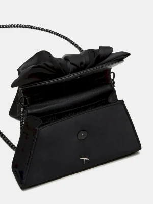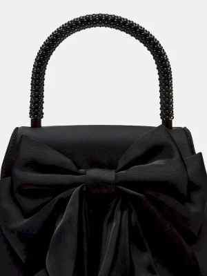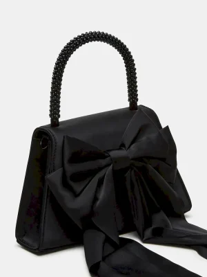 Introducing the sophisticated COSETTE bag. Expertly crafted with smooth satin and a beaded top handle, this elegant bag features a long satin bow and a structured top handle for a touch of glamour. The interior back slit pocket and detachable chain strap add practicality to its angled, trapezoid silhouette. Perfect for any formal occasion, this bag is a must-have for the style-conscious individual.
