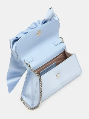 Introducing the sophisticated COSETTE bag. Expertly crafted with smooth satin and a beaded top handle, this elegant bag features a long satin bow and a structured top handle for a touch of glamour. The interior back slit pocket and detachable chain strap add practicality to its angled, trapezoid silhouette. Perfect for any formal occasion, this bag is a must-have for the style-conscious individual.