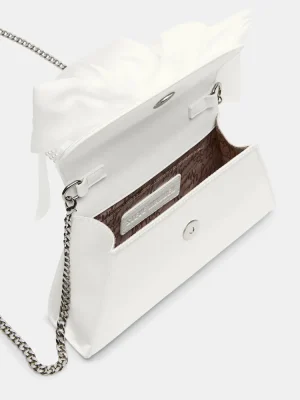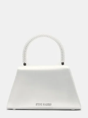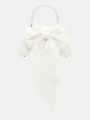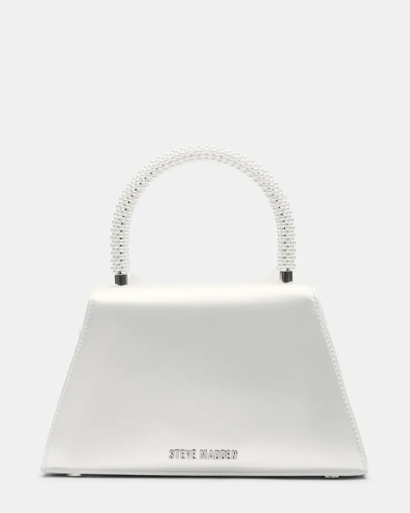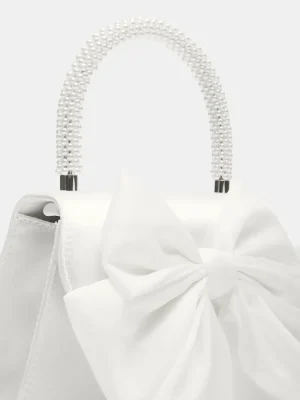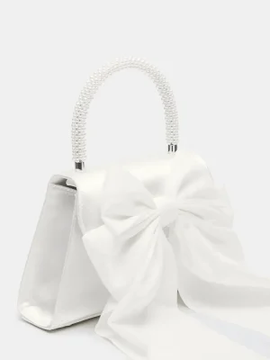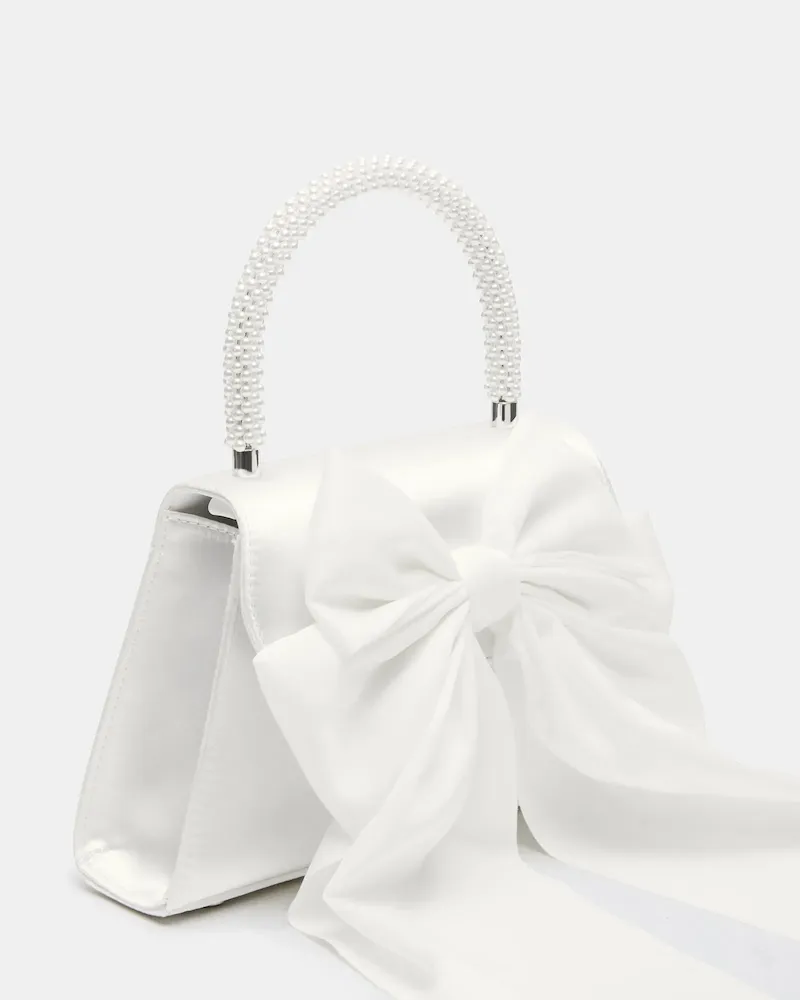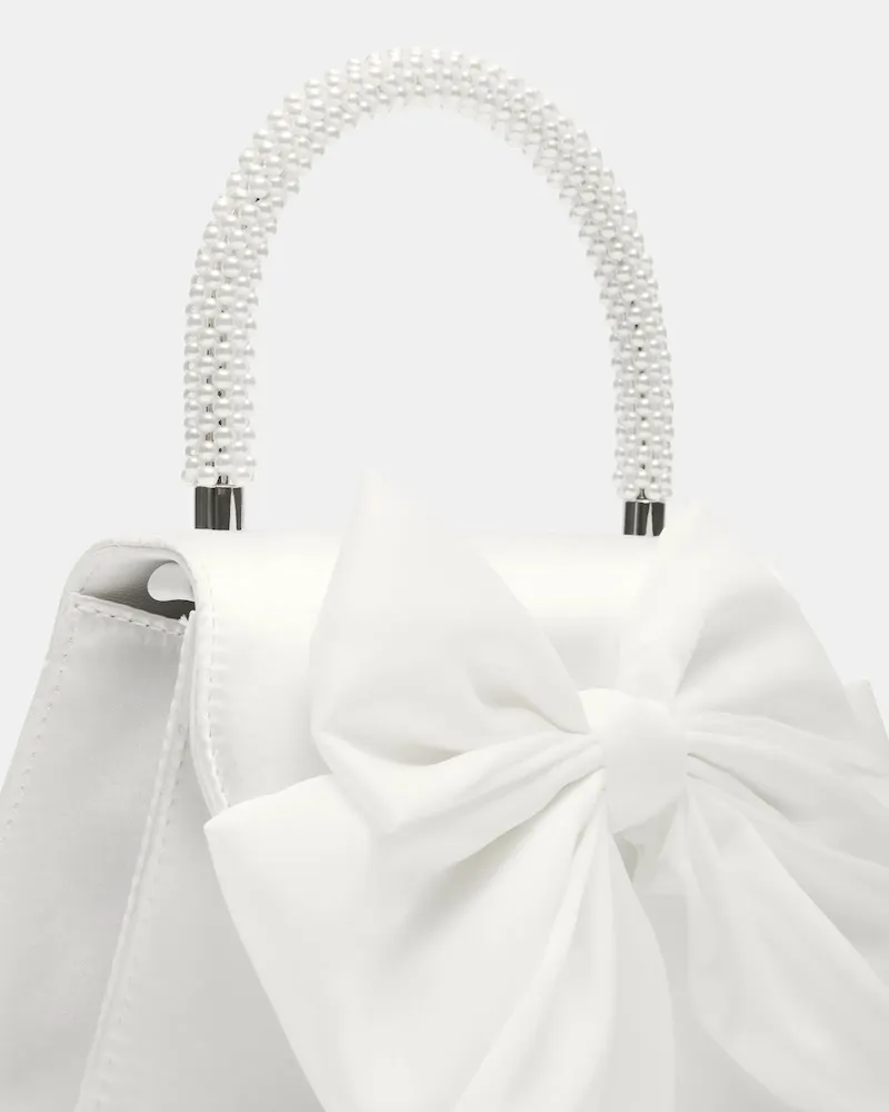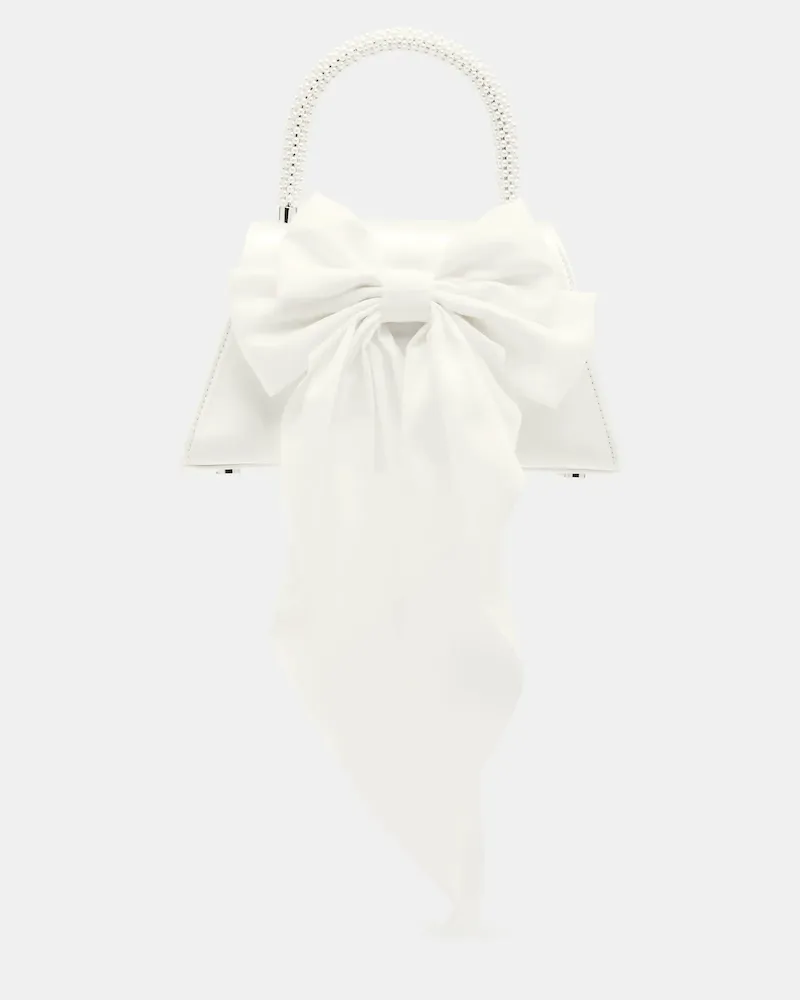 Introducing the sophisticated COSETTE bag. Expertly crafted with smooth satin and a beaded top handle, this elegant bag features a long satin bow and a structured top handle for a touch of glamour. The interior back slit pocket and detachable chain strap add practicality to its angled, trapezoid silhouette. Perfect for any formal occasion, this bag is a must-have for the style-conscious individual.