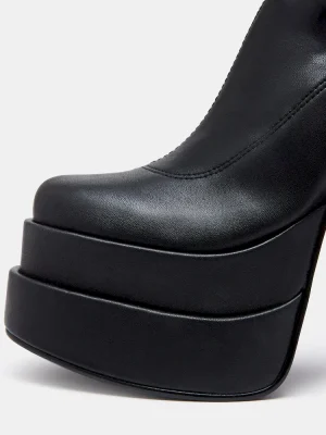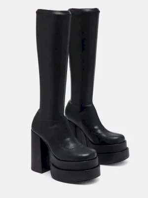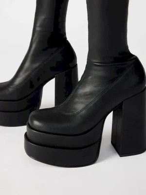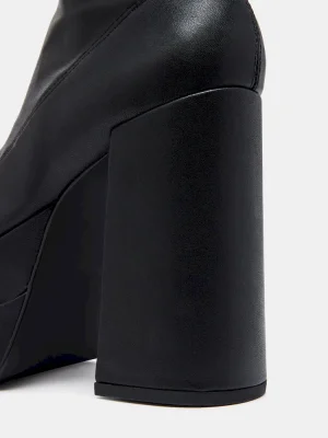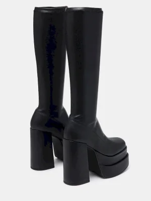 The CYPRESS knee boot combines a stretchy upper and an extra-high block heel for the ultimate leg-lengthening, calf-defining fit. The tiered front platform keeps your steps balanced and secure with a wide base.