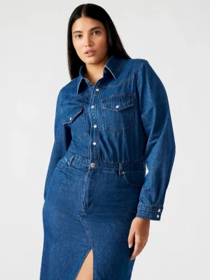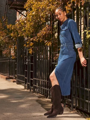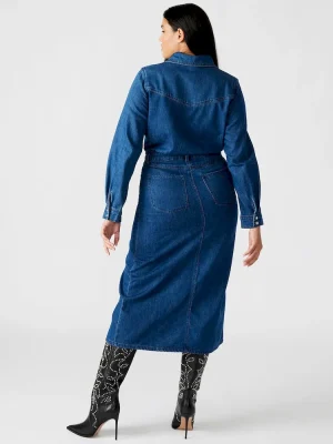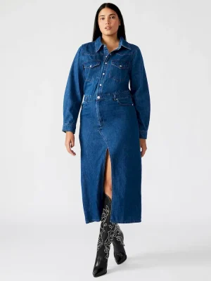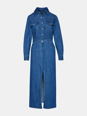 Elevate your wardrobe with our DAKODA dress. Crafted with a denim long-sleeve bodice, button-down maxi dress, and shank to zip front skirt, this dress exudes effortless style. The center front slit adds a touch of femininity, while the skirt pockets provide both convenience and practicality. Perfect for any occasion, this dress will be a staple in your closet.