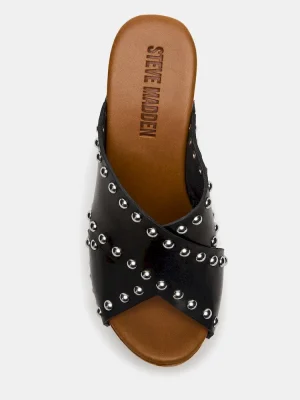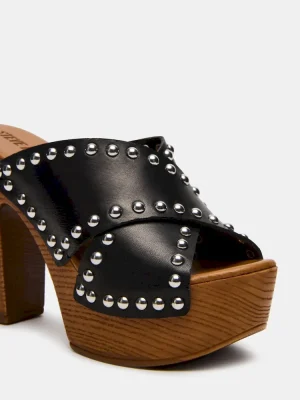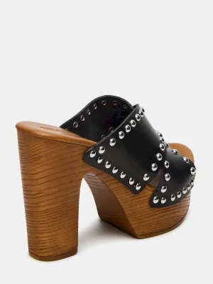 The DEMI sandal features a stylish platform design with studded detailing, complemented by a natural wood bottom for durability and a rustic touch. Its mule silhouette offers easy slip-on convenience while maintaining a sophisticated look, making it a versatile choice for elevated casual wear.