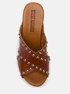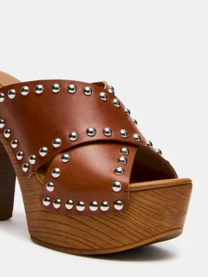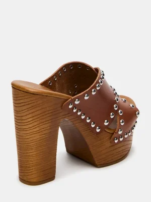 The DEMI sandal features a stylish platform design with studded detailing, complemented by a natural wood bottom for durability and a rustic touch. Its mule silhouette offers easy slip-on convenience while maintaining a sophisticated look, making it a versatile choice for elevated casual wear.