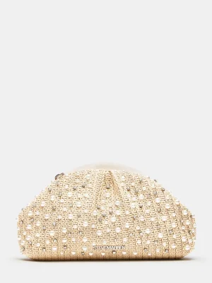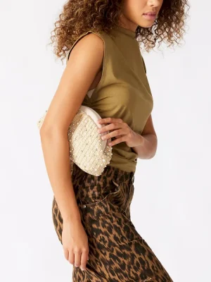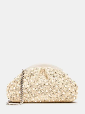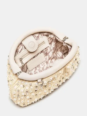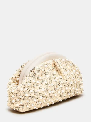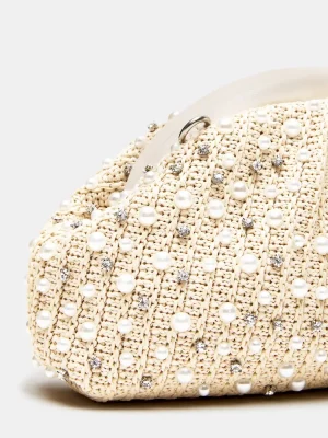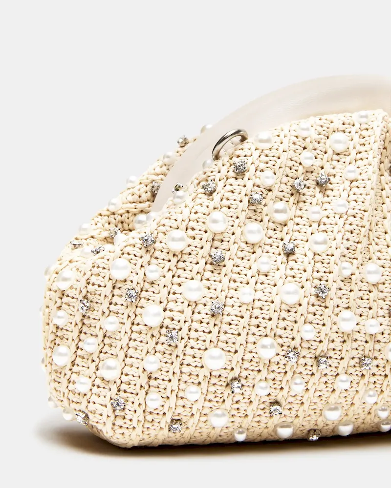 Elevate your accessory game with the DEVEN bag This elegant straw clutch is adorned with pearl and crystal rhinestones, adding a touch of sophistication to any outfit. The chain crossbody strap allows for versatile styling, perfect for any occasion.