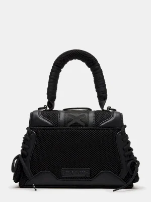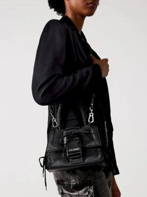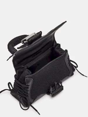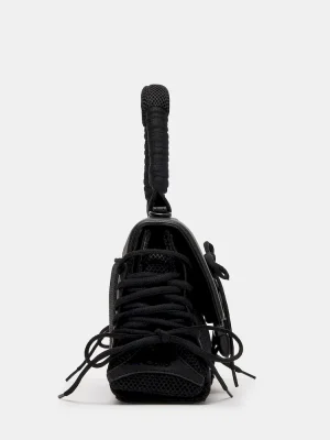The DIEGO bag is a structured trapezoid bag with athletic-inspired details like mesh overlay panels, sneaker style lacing, and an oversized quick release buckle closure.