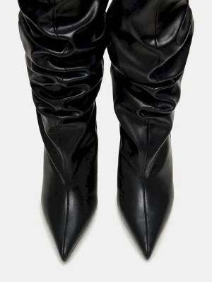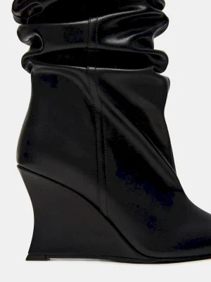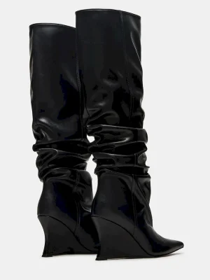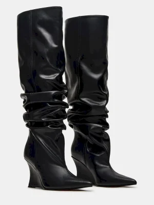 The DISTORTION boot features a scrunched design, wedge heel, and a pointed-toe, extending to knee height for a bold, fashion-forward silhouette. Crafted to combine edgy style with comfortable wear, this boot elevates any outfit with its sleek design and distinctive wedge support. Ideal for those seeking a statement piece that balances trend and practicality.