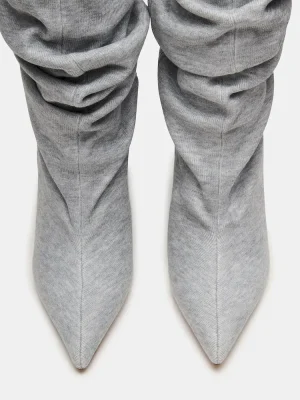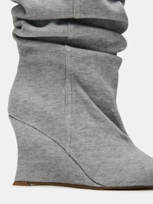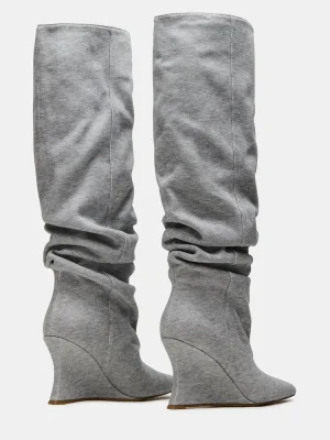 The DISTORTION boot features a scrunched design, wedge heel, and a pointed-toe, extending to knee height for a bold, fashion-forward silhouette. Crafted to combine edgy style with comfortable wear, this boot elevates any outfit with its sleek design and distinctive wedge support. Ideal for those seeking a statement piece that balances trend and practicality.