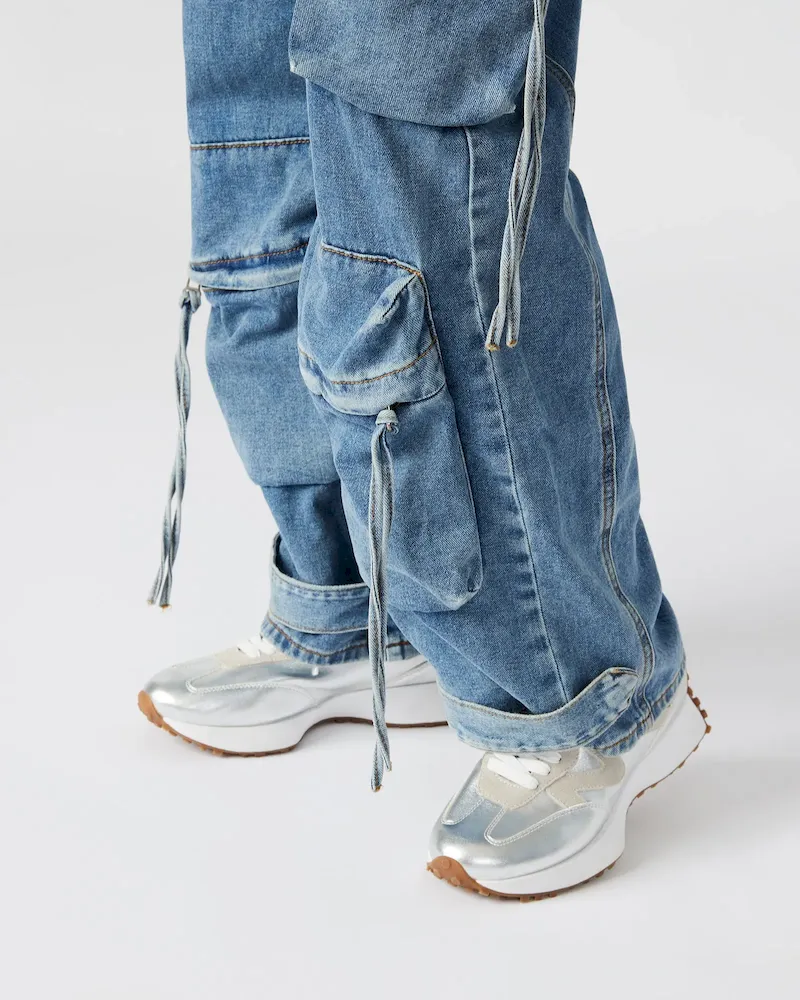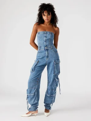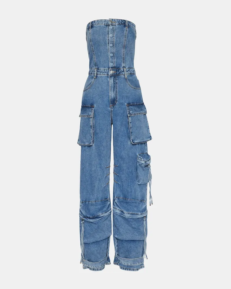 Expertly designed for a structured and voluminous fit, the strapless DUO jumpsuit is crafted from stretch denim. With adjustable ankle straps, this wide leg cargo jumpsuit offers a versatile silhouette that can be easily customized to your preference.