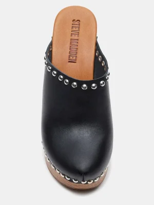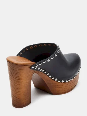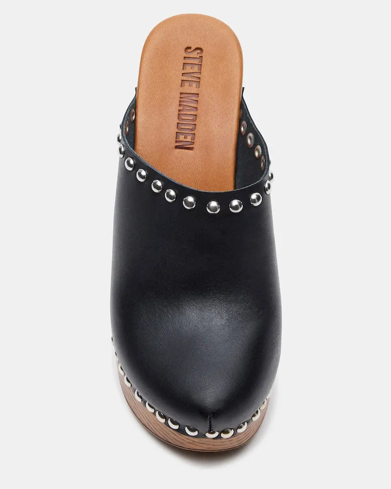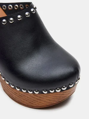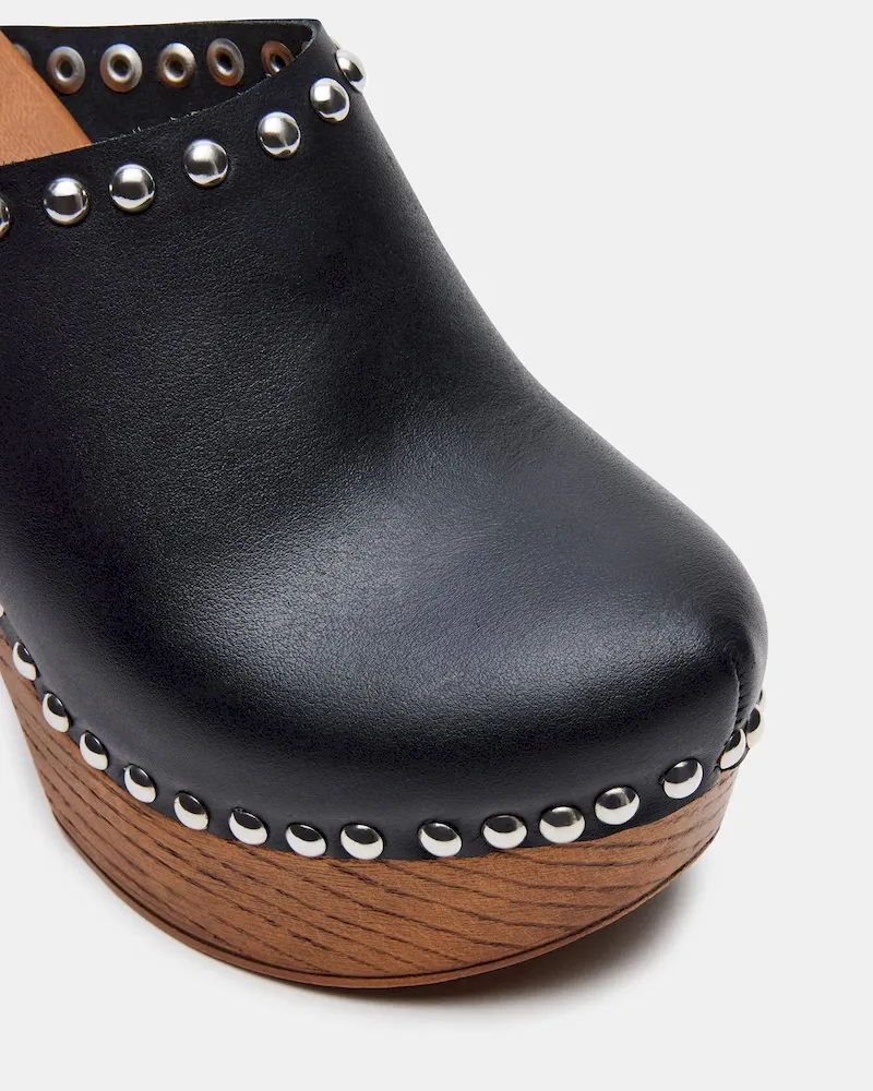 Elevate your style with the DUTCHESS platform mule heel. Featuring a wooden bottom and clog design, this shoe will add a unique touch to any outfit. The studded details add a subtle edge. Walk confidently with the sturdy platform and enjoy the added height and comfort.