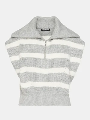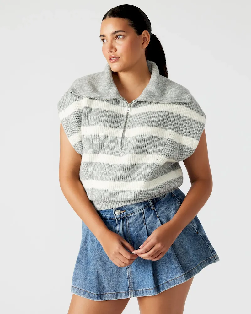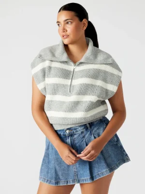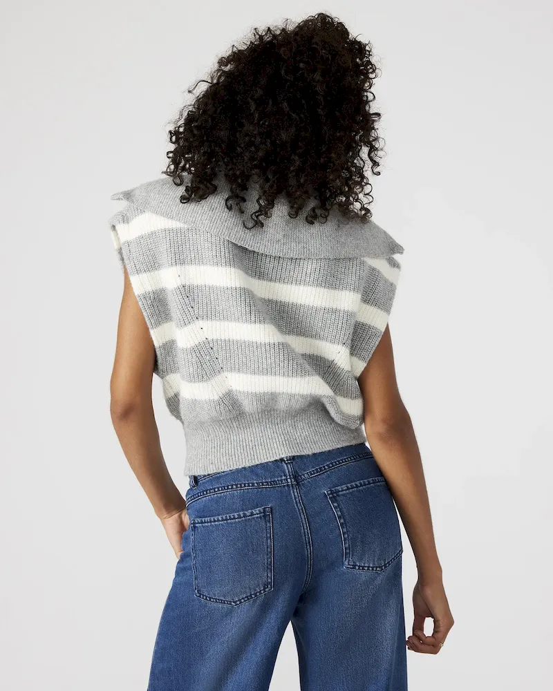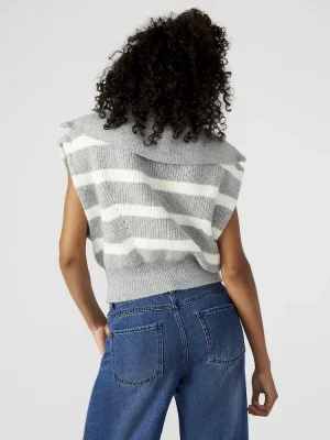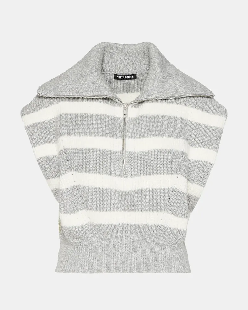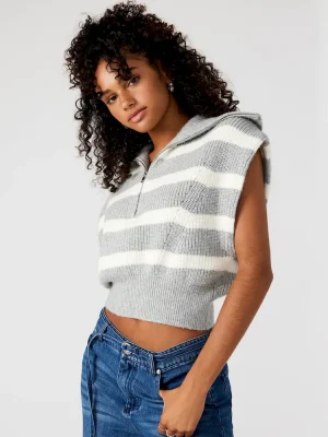 Stay stylish with the EASTON sweater Its hooded sleeveless design, stripe pattern, and wide collar offer both comfort and fashion. The half-zipper metal closure adds a touch of practicality, while the relaxed fit guarantees a flattering look. Perfect for days on the go.