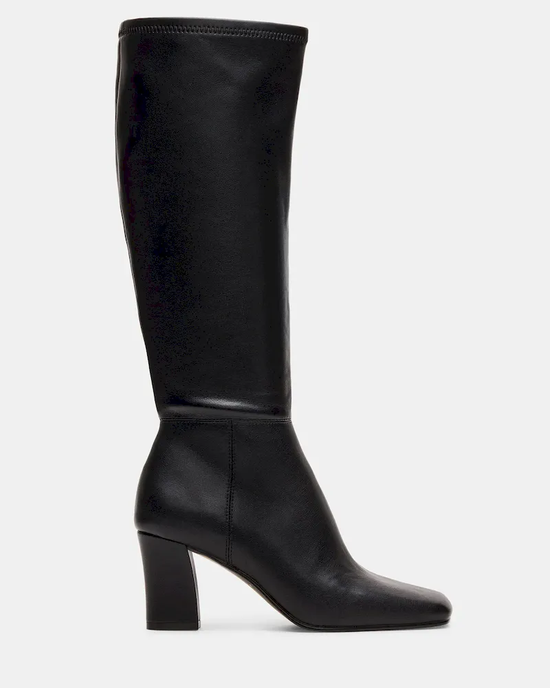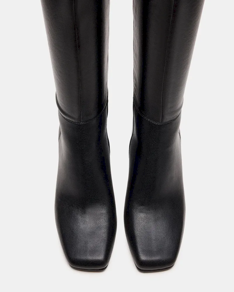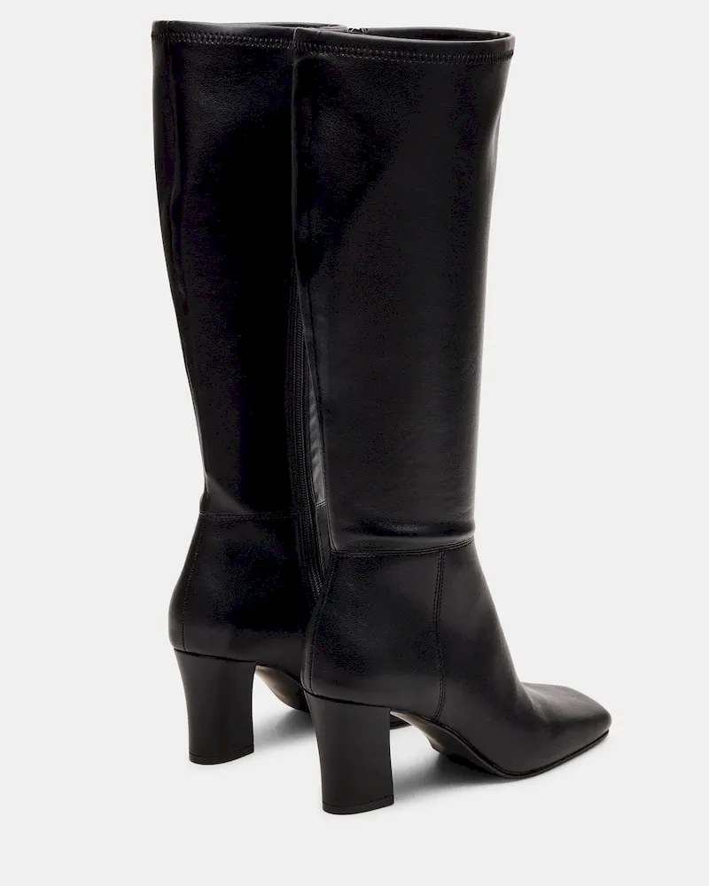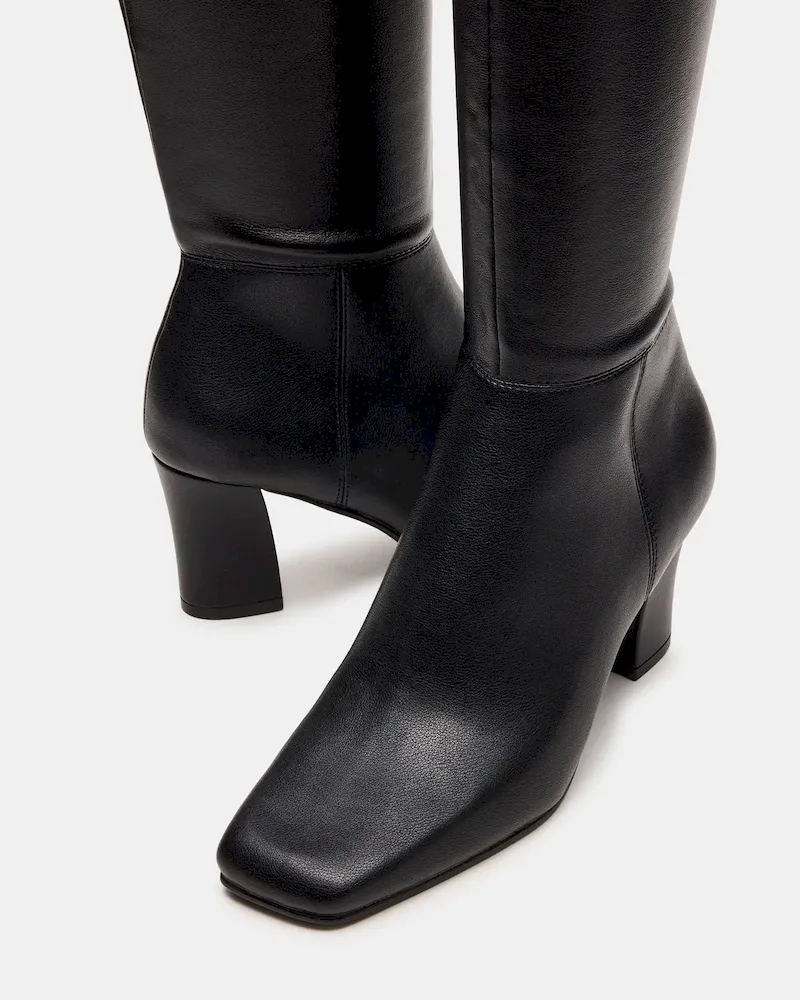 Elevate your footwear collection with the ELLIOT BLACK, a sleek square-toe knee-high boot designed for both style and stability. Featuring a sturdy block heel, this boot offers confident support and a modern silhouette. Its tall shaft provides versatile coverage that pairs effortlessly with various outfits, making it a sophisticated choice for any occasion.