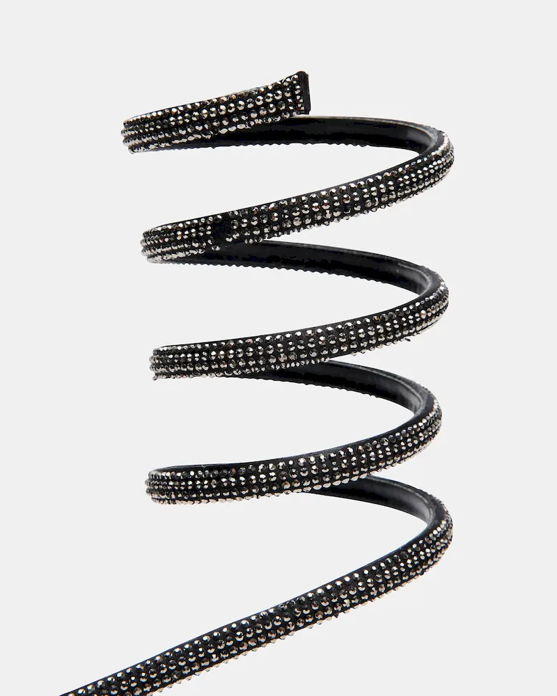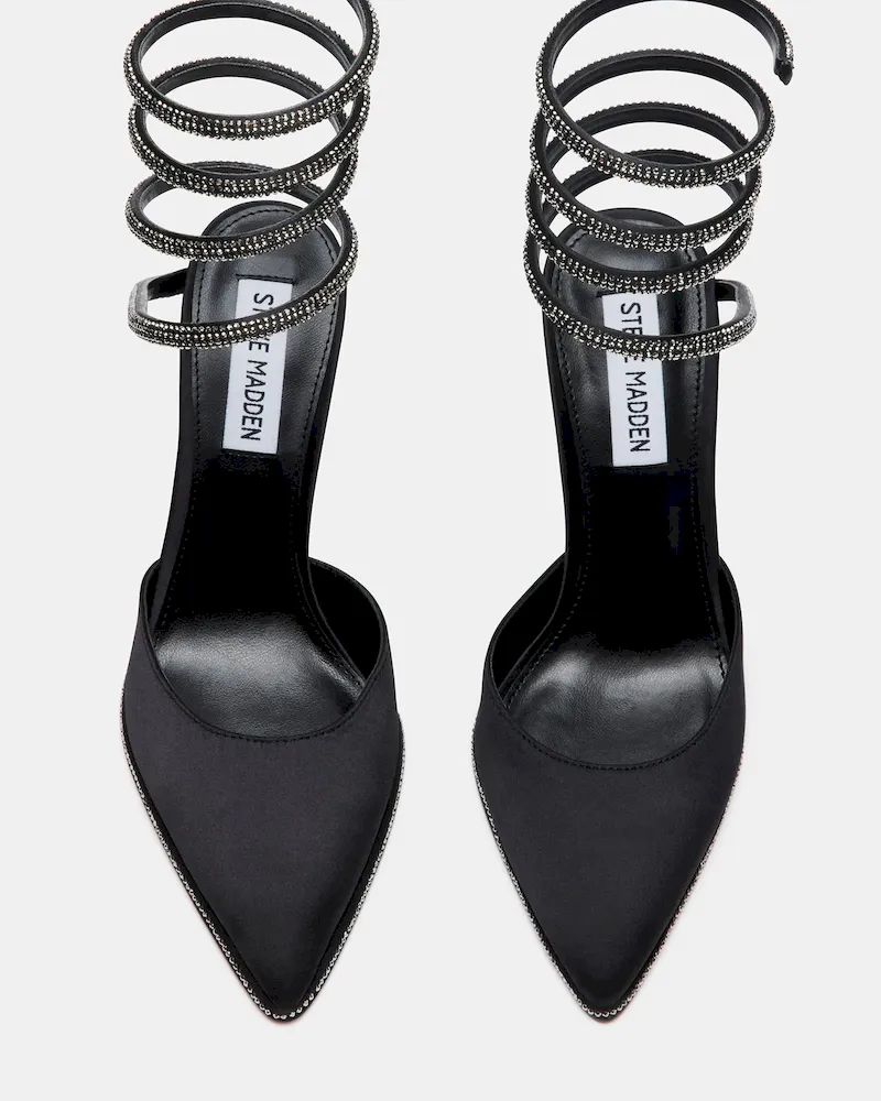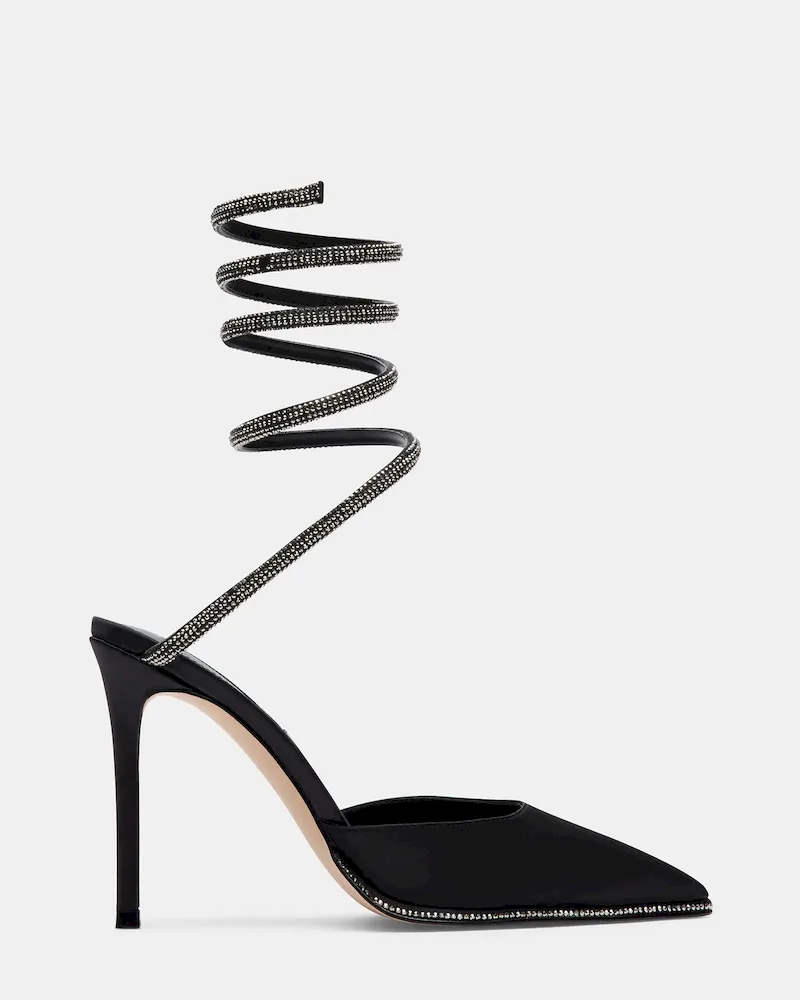 SOPHISTICATED + OPULENT + DIFFERENTThe EMERSON stiletto pump features a point toe and open back secured with a coiled ankle strap. Tiny rhinestones set around the welt of the toe and on the ankle strap add subtle sparkle to your step.
