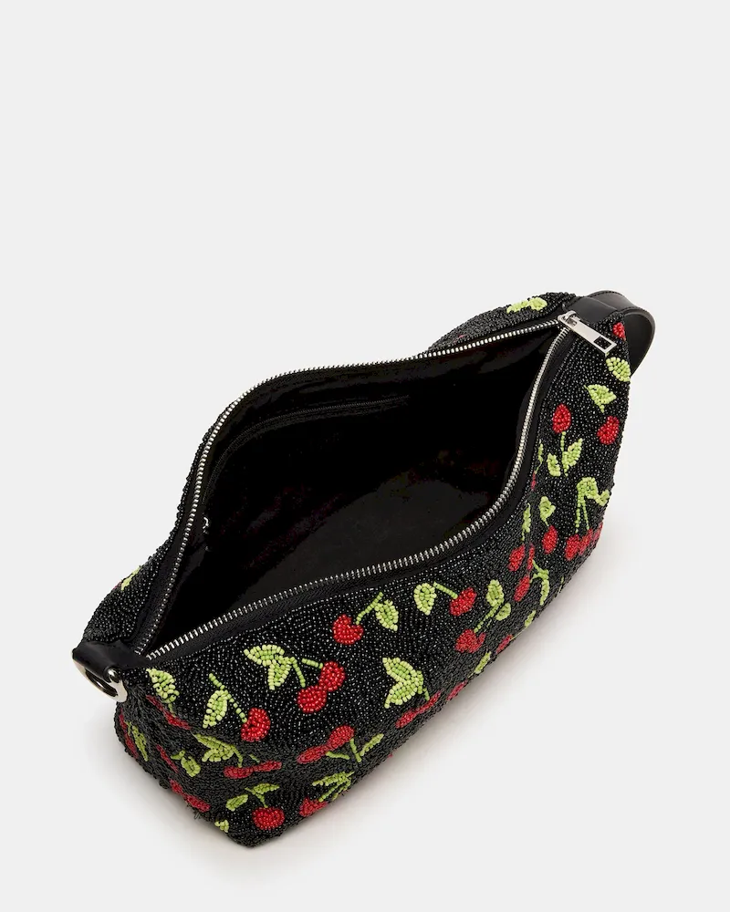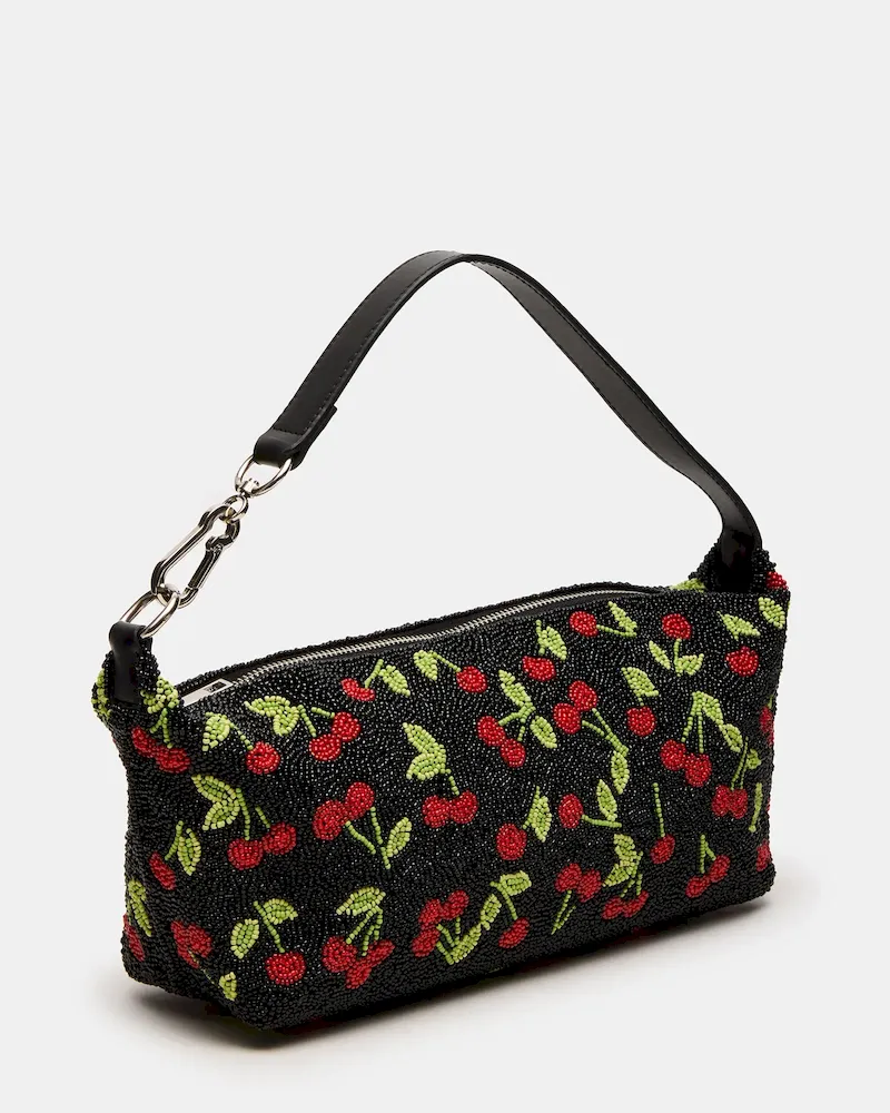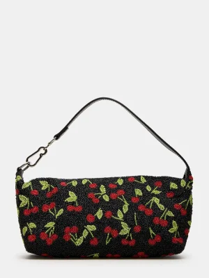 Expertly designed, the EMERSYN bag boasts fully beaded details and a cherry design beaded into the bag. With hardware to attach charms and secure zipper closure, this bag also features a back wall zipper pocket for additional storage. Exude style and functionality with this chic accessory.