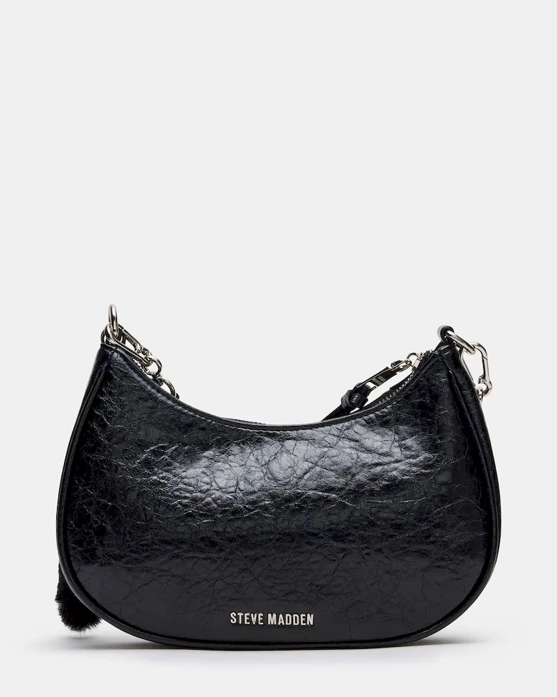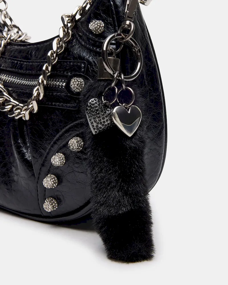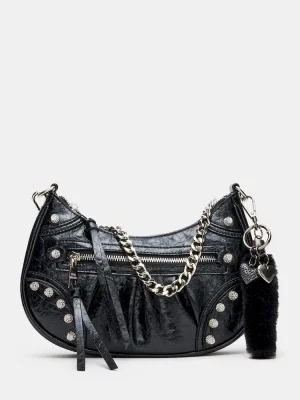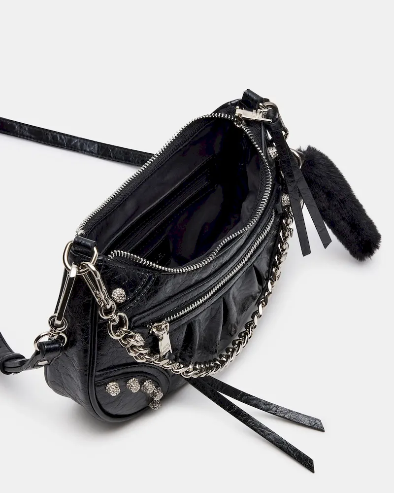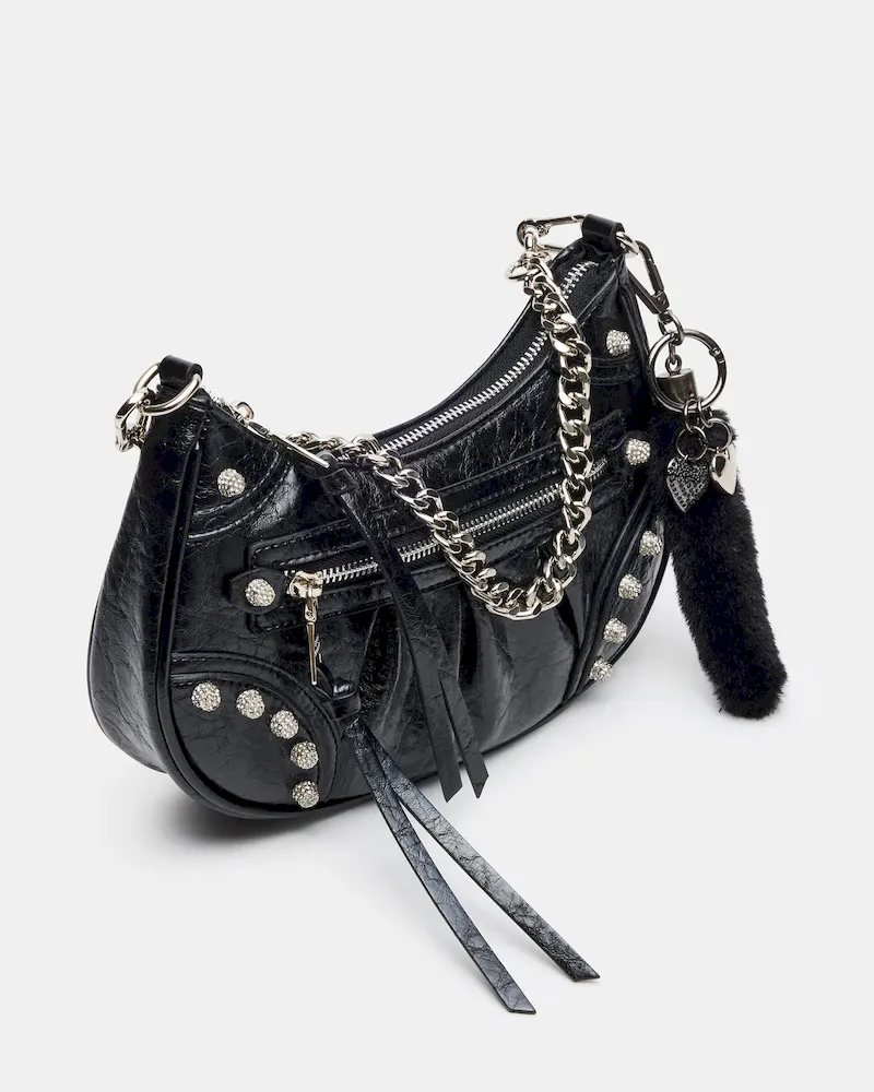 The ERIKA bag combines edgy elegance with practical design. Featuring studded pave rhinestones, this crinkle-textured crossbody adds a touch of sparkle to any outfit. Its chain shoulder strap offers a sleek look, while the detachable and adjustable crossbody strap ensures customizable wear. A detachable bag charm adds personalized flair, and the top-zipper closure provides secure and easy access to your essentials. Perfect for day-to-night wear, this bag balances stylish detail with functional versatility.