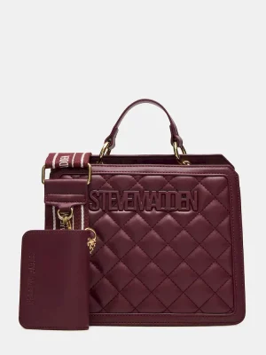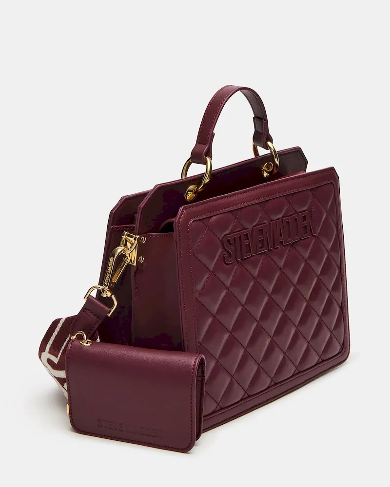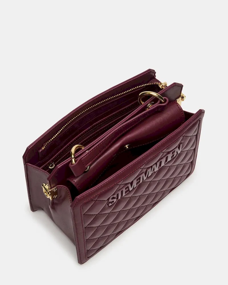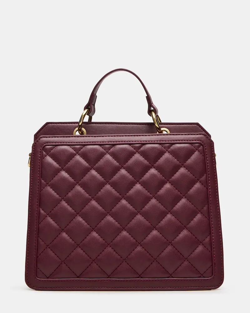 Clever interior organization and a matching pouch give the compact EVELYN BAG BLOODSTONE QUILTED surprisingly roomy storage. Reinforced edges, structured side gussets, and custom hardware add to the substantial look and feel of this top-handle design.