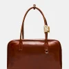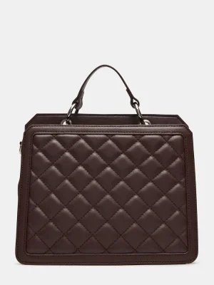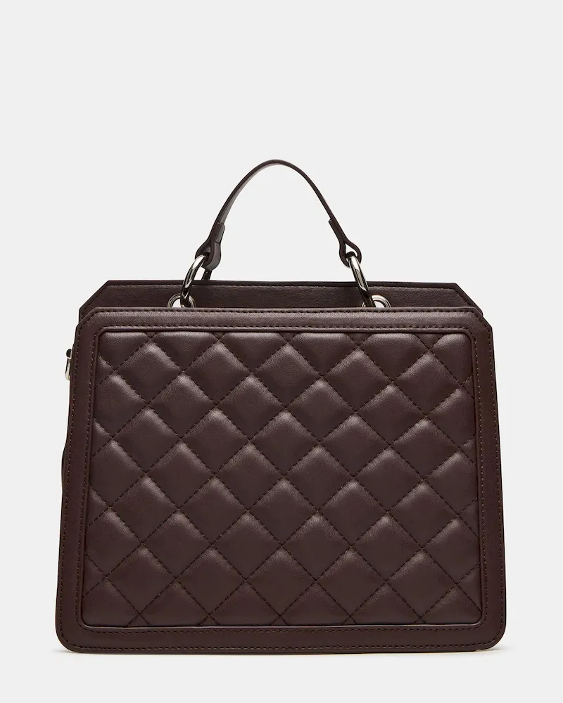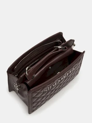 Clever interior organization and a matching pouch give the compact EVELYN BAG BLOODSTONE QUILTED surprisingly roomy storage. Reinforced edges, structured side gussets, and custom hardware add to the substantial look and feel of this top-handle design.